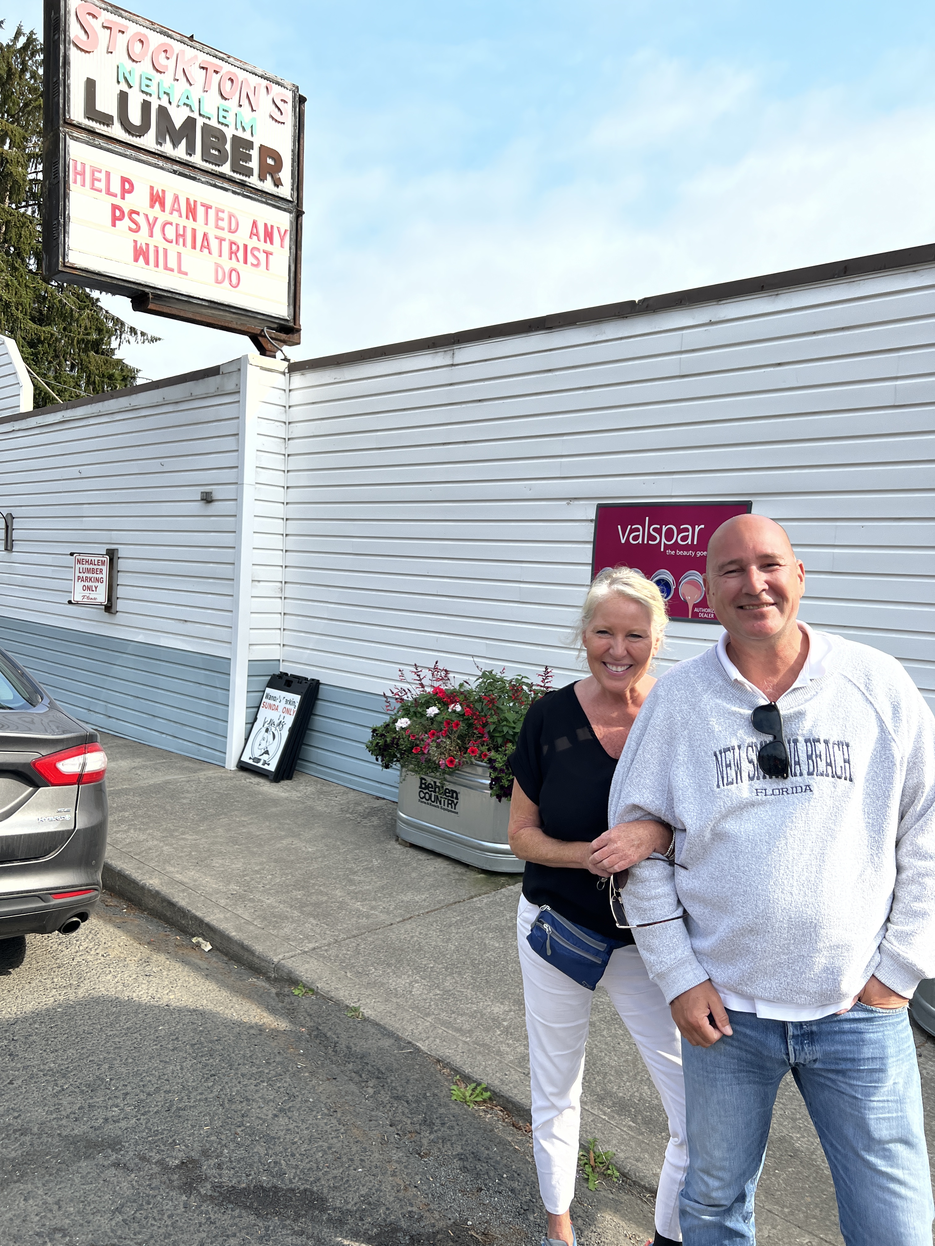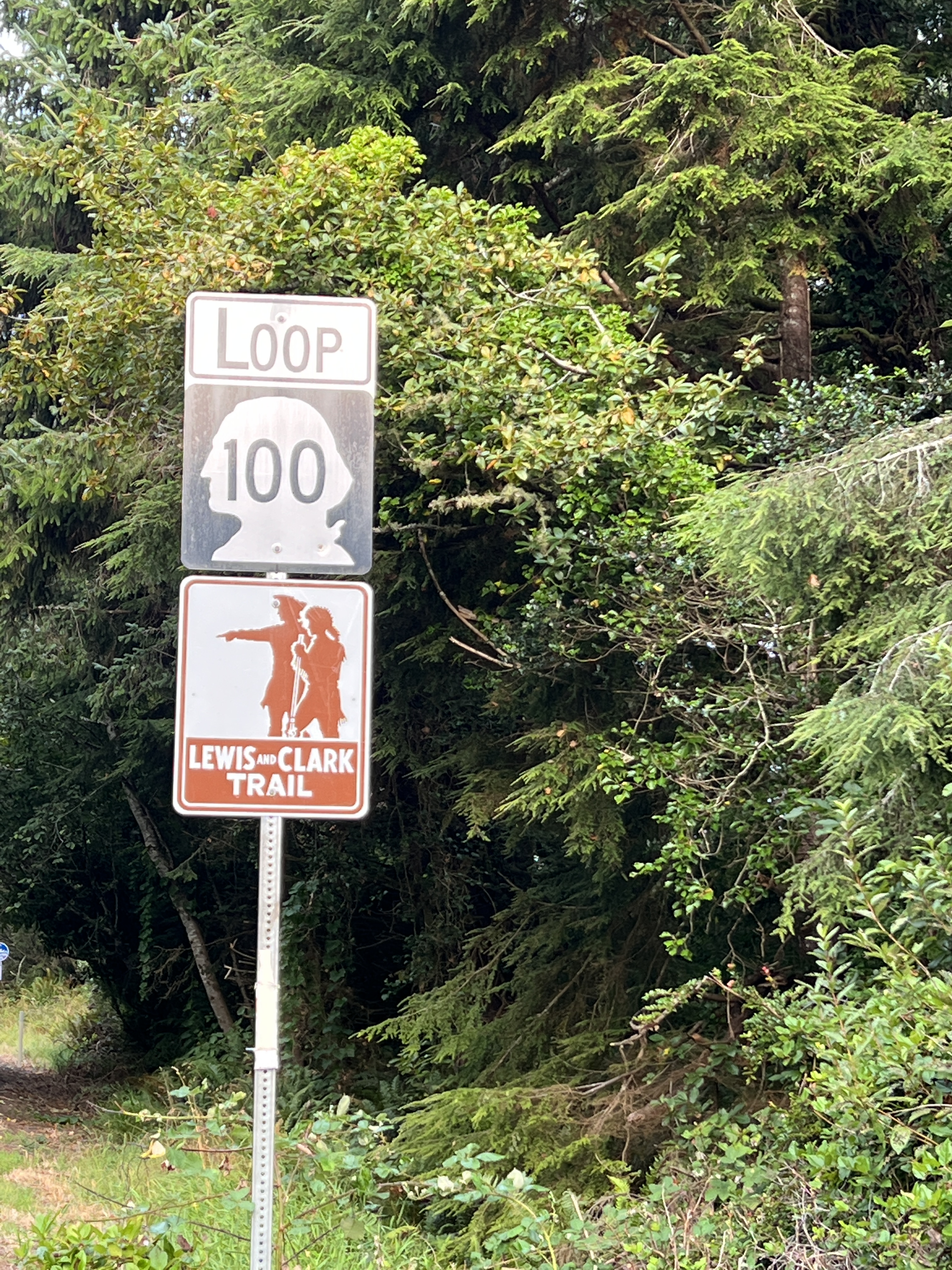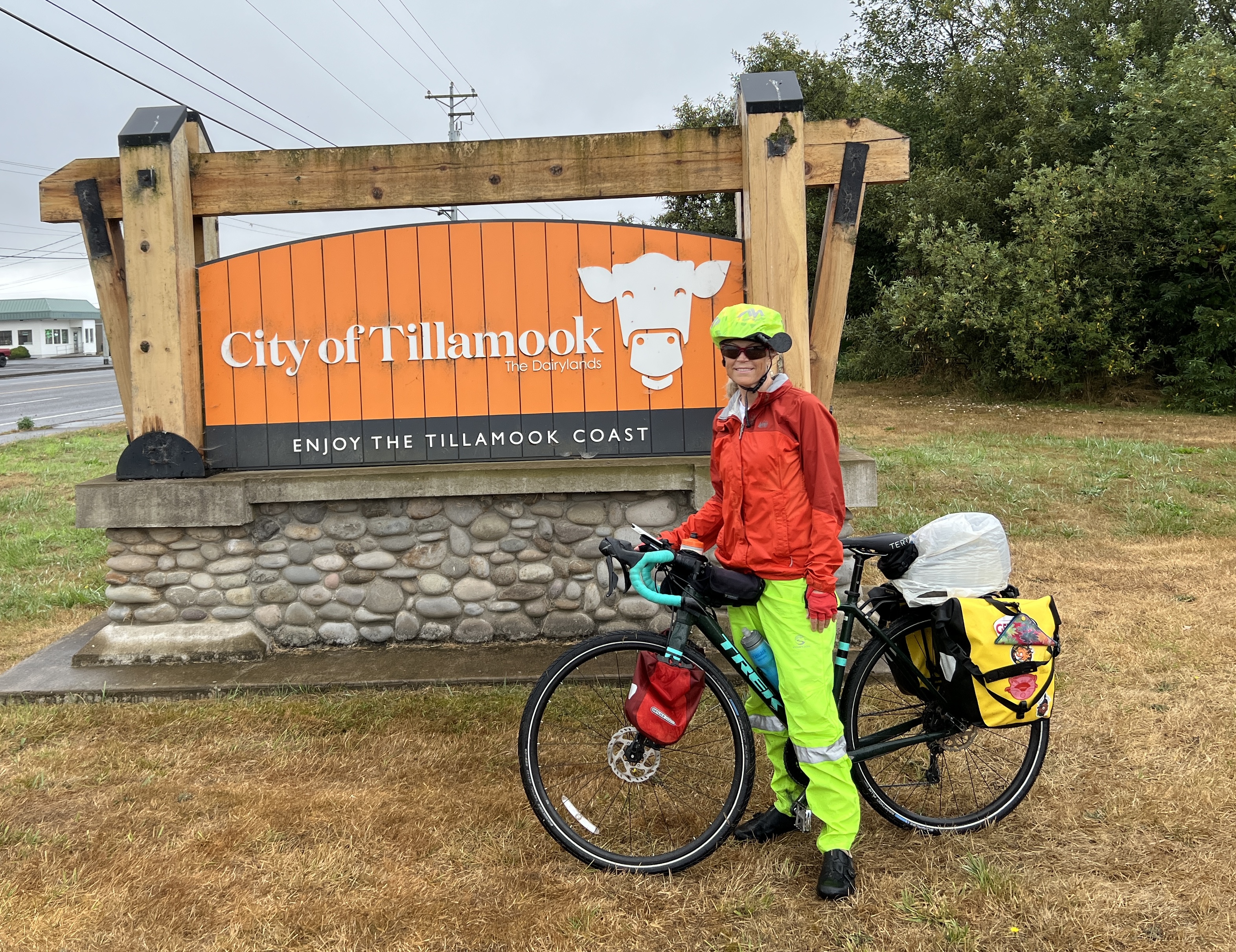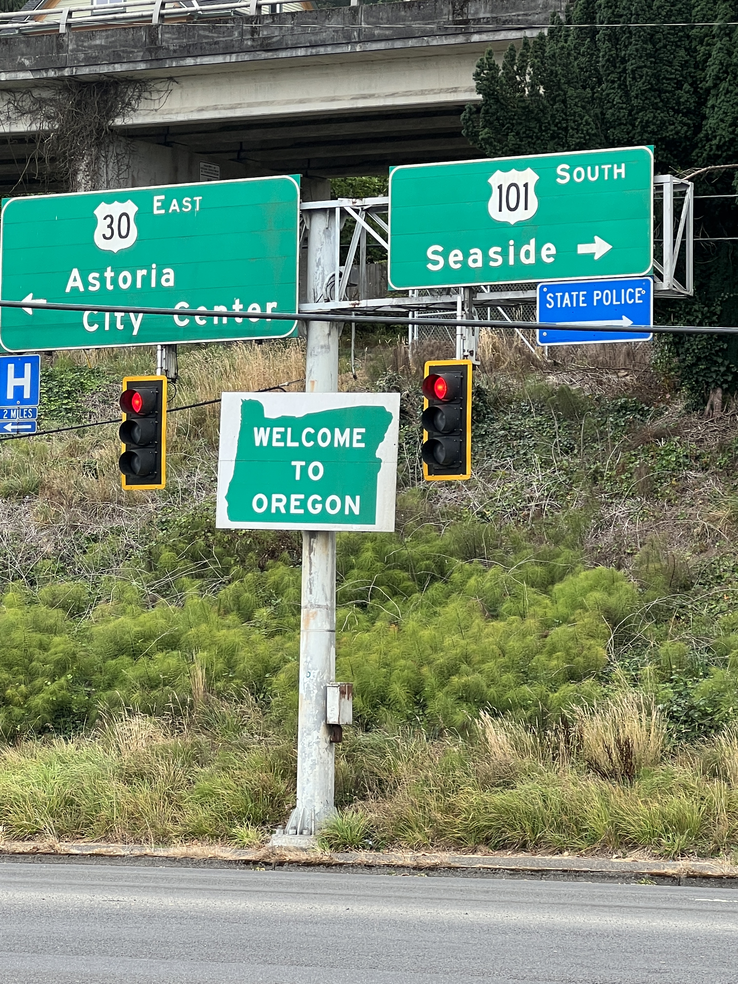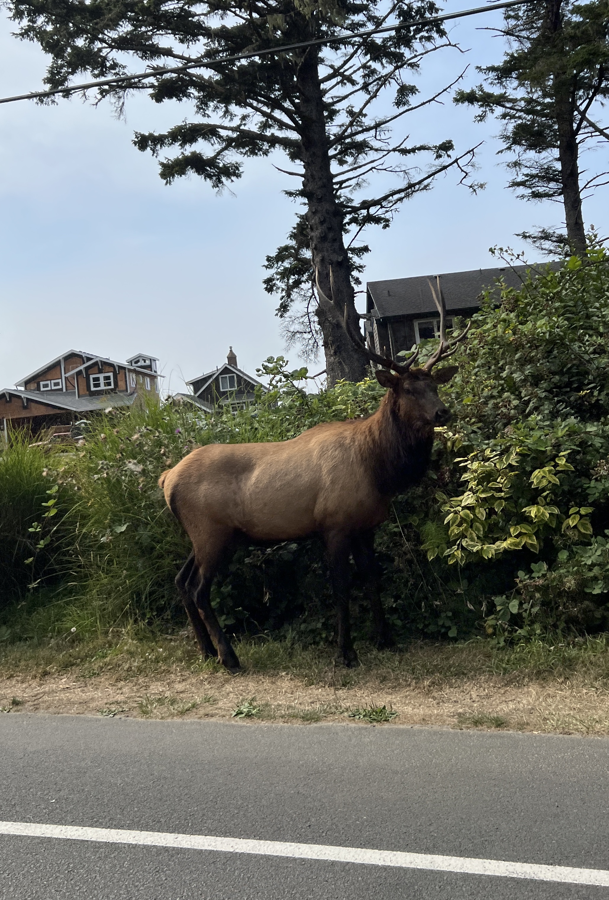 Long Beach to Nehalem, over the Astoria bridge and via Seaside (for brunch) and Canon Beach (visited Miska’s gallery). Passed some elk in Canon Beach (NOT zoomed in)! Surprise cheering squad in Nehalem (Mary and Jens, funny sign above them) and stayed with artist friend MJ.