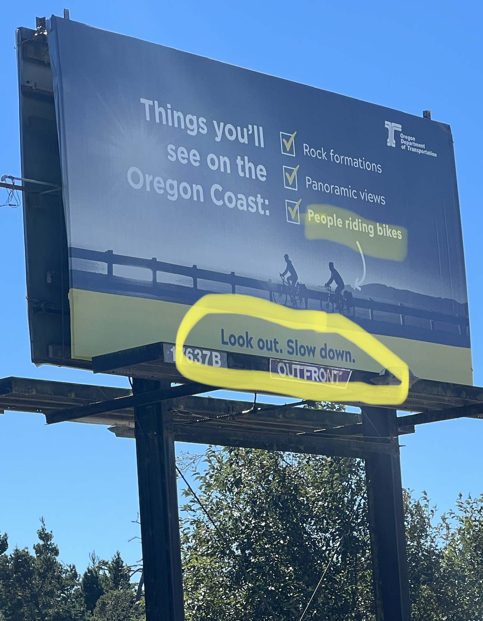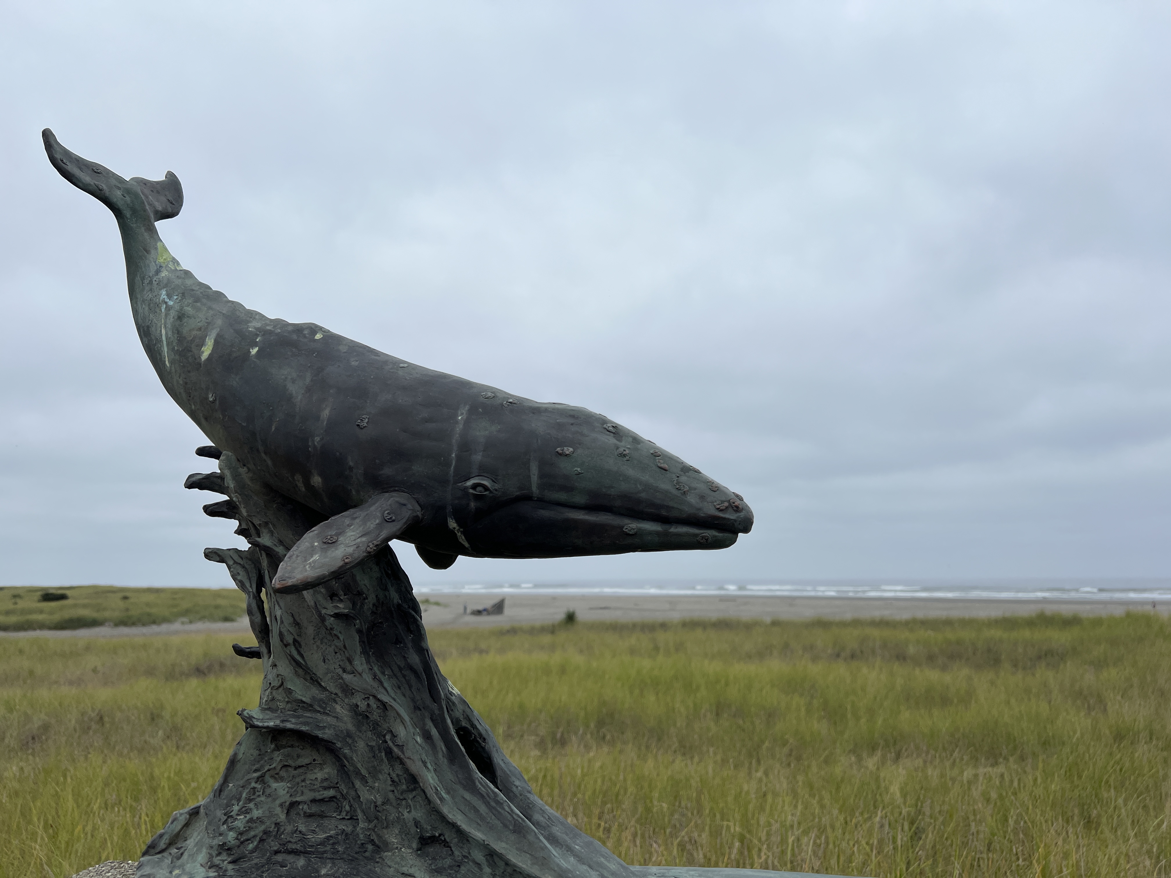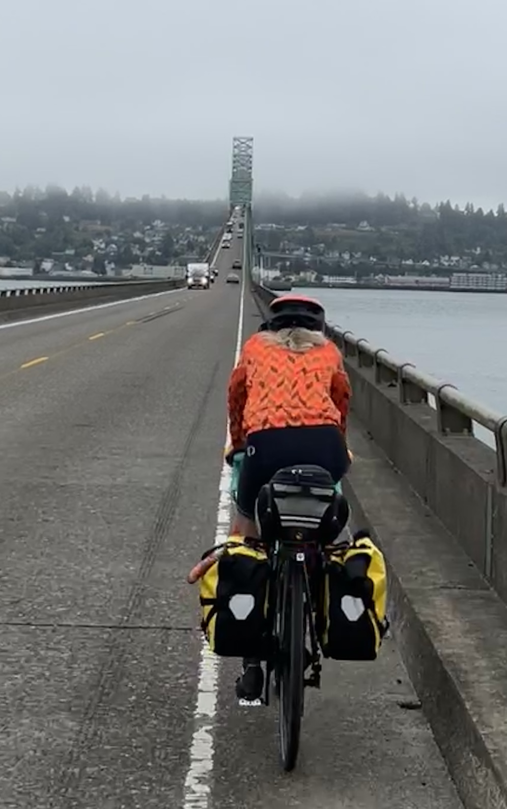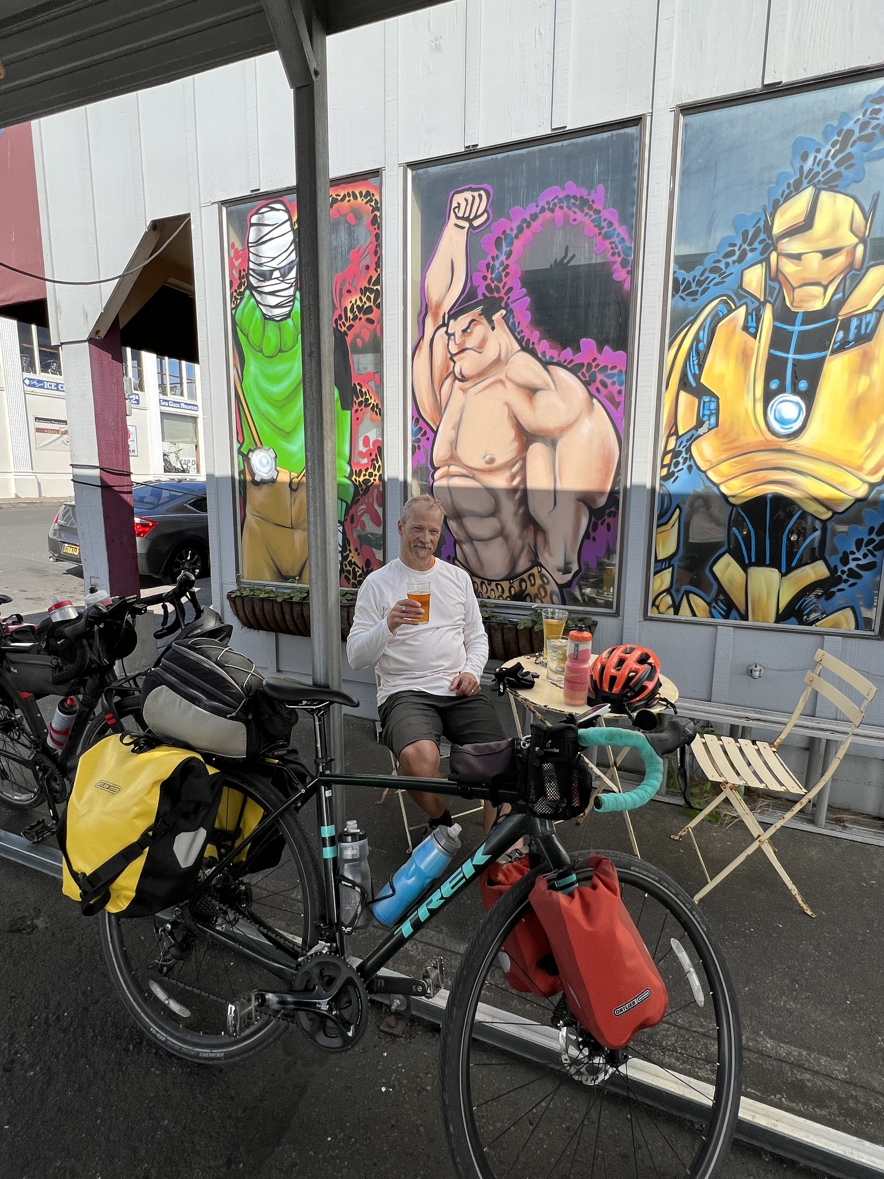 Long Beach to Nehalem, over the Astoria bridge and via Seaside (for brunch) and Canon Beach (visited Miska’s gallery). Passed some elk in Canon Beach (NOT zoomed in)! Surprise cheering squad in Nehalem (Mary and Jens, funny sign above them) and stayed with artist friend MJ.