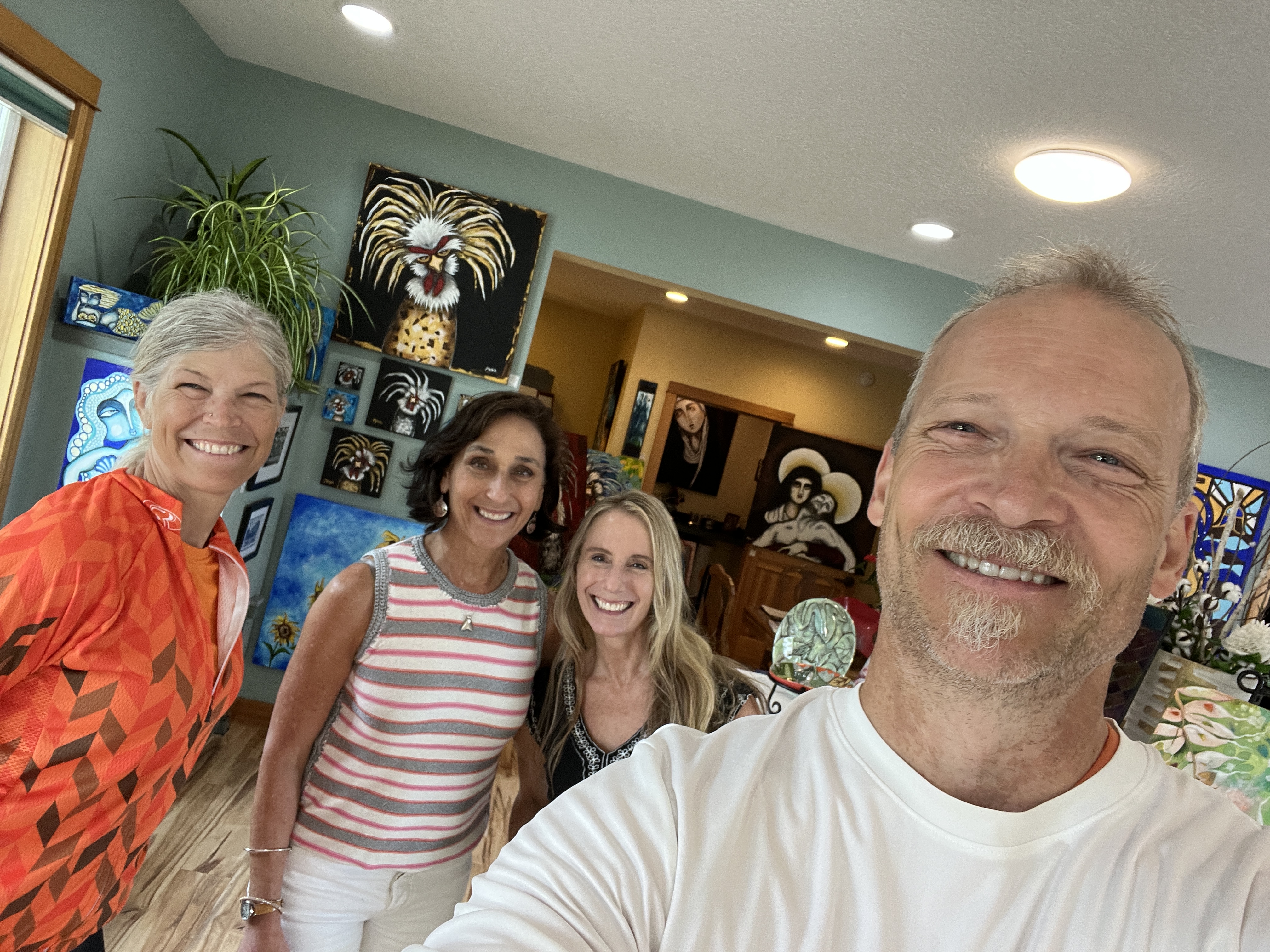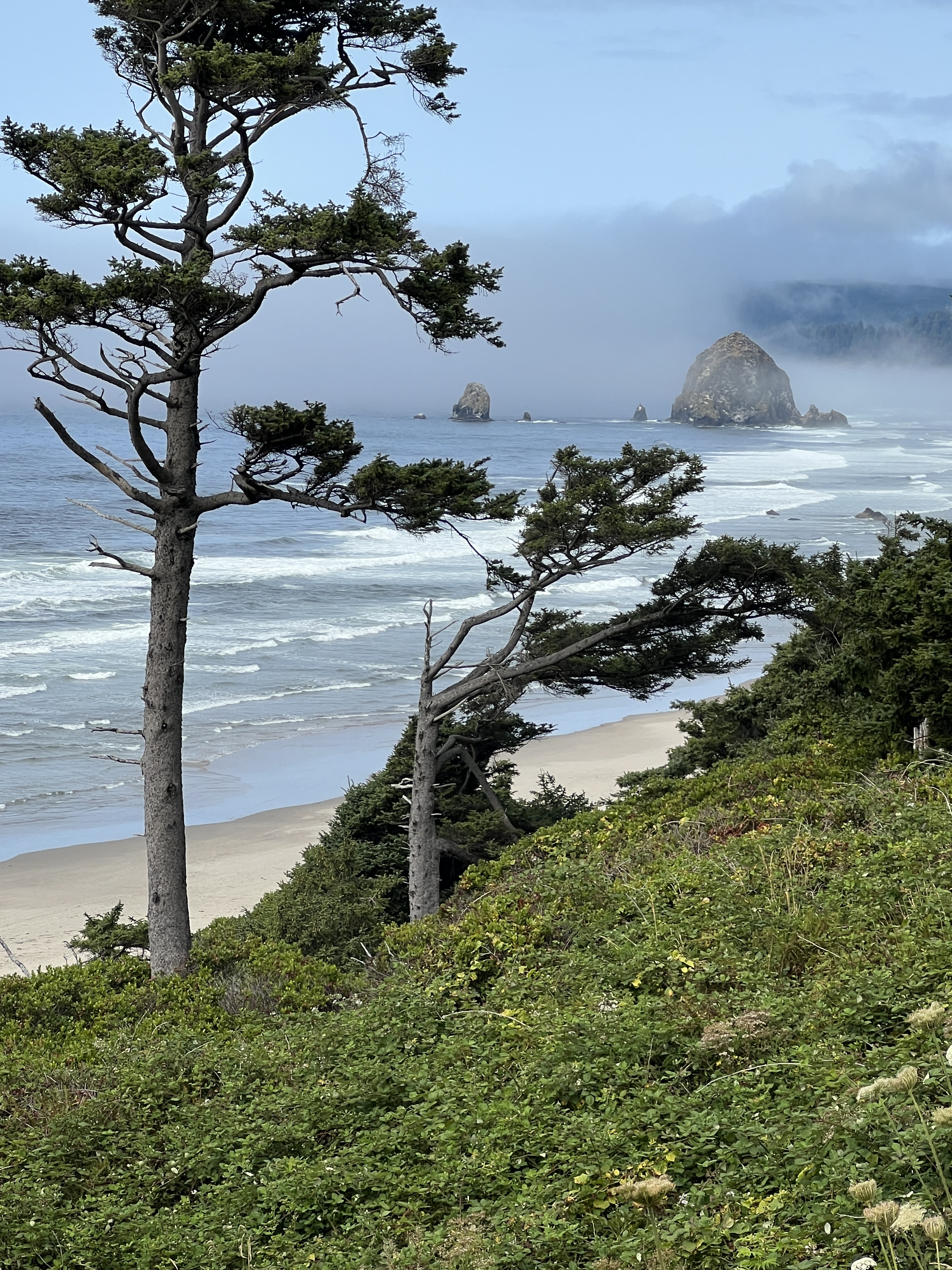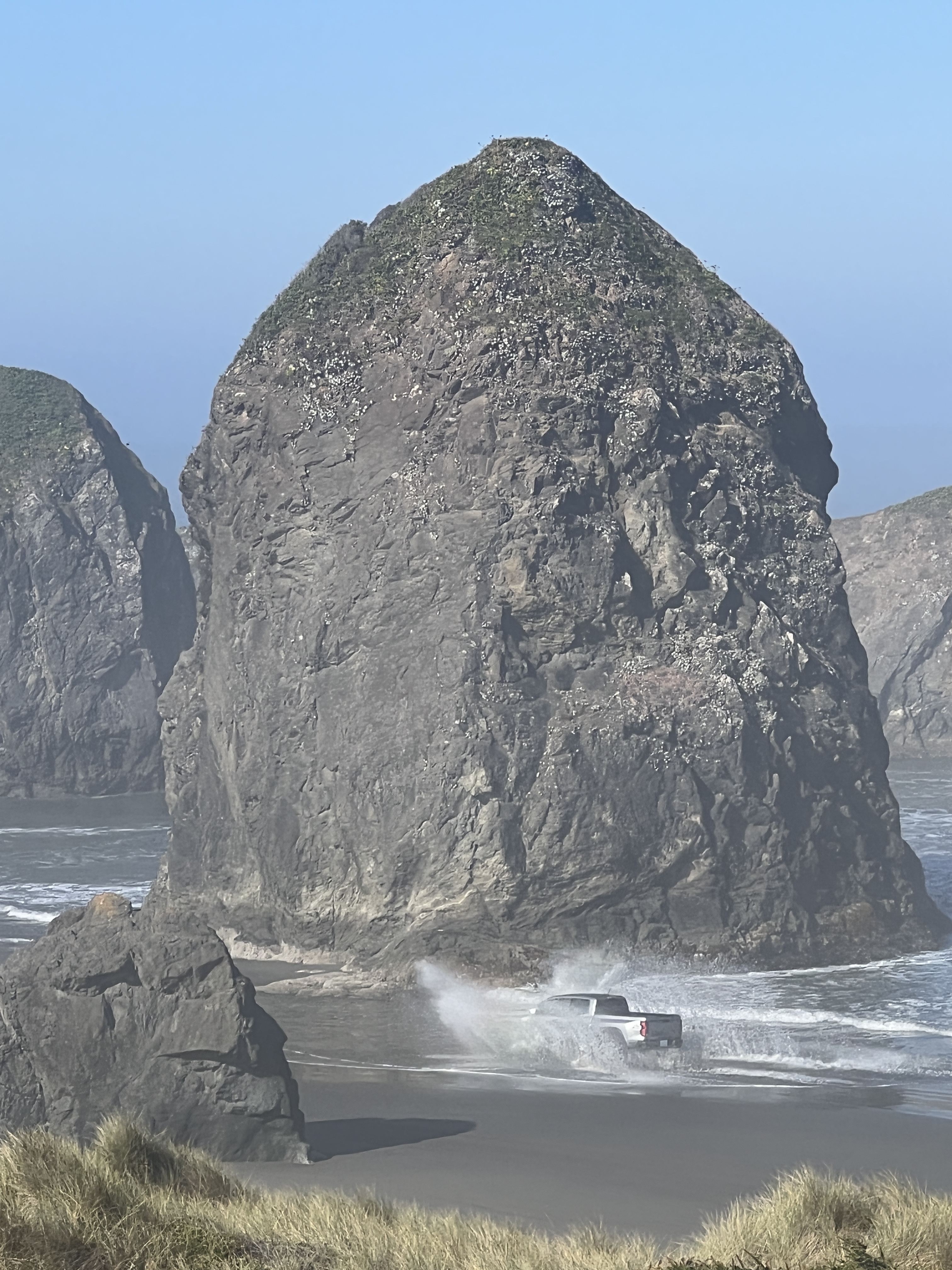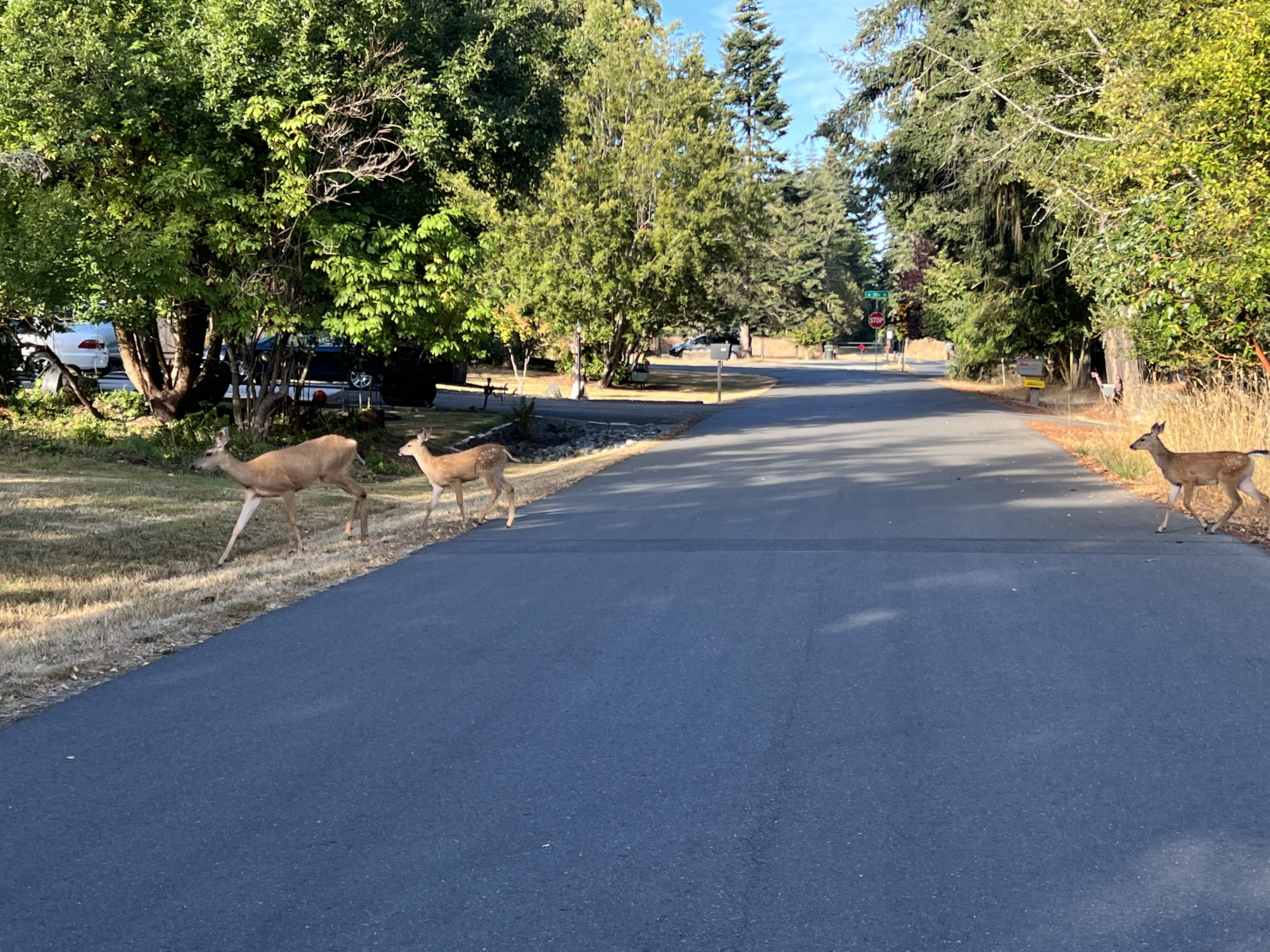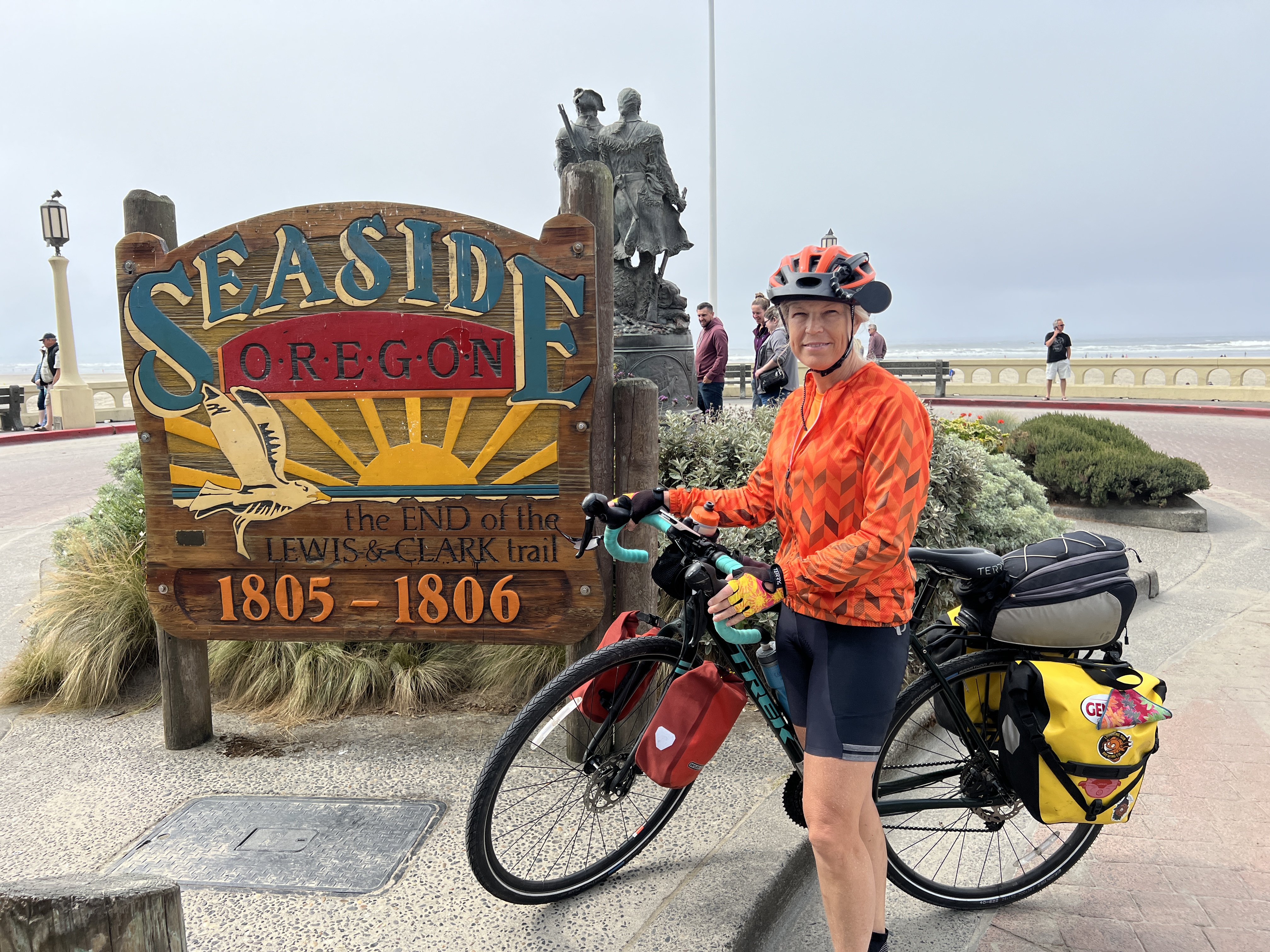 Long Beach to Nehalem, over the Astoria bridge and via Seaside (for brunch) and Canon Beach (visited Miska’s gallery). Passed some elk in Canon Beach (NOT zoomed in)! Surprise cheering squad in Nehalem (Mary and Jens, funny sign above them) and stayed with artist friend MJ.