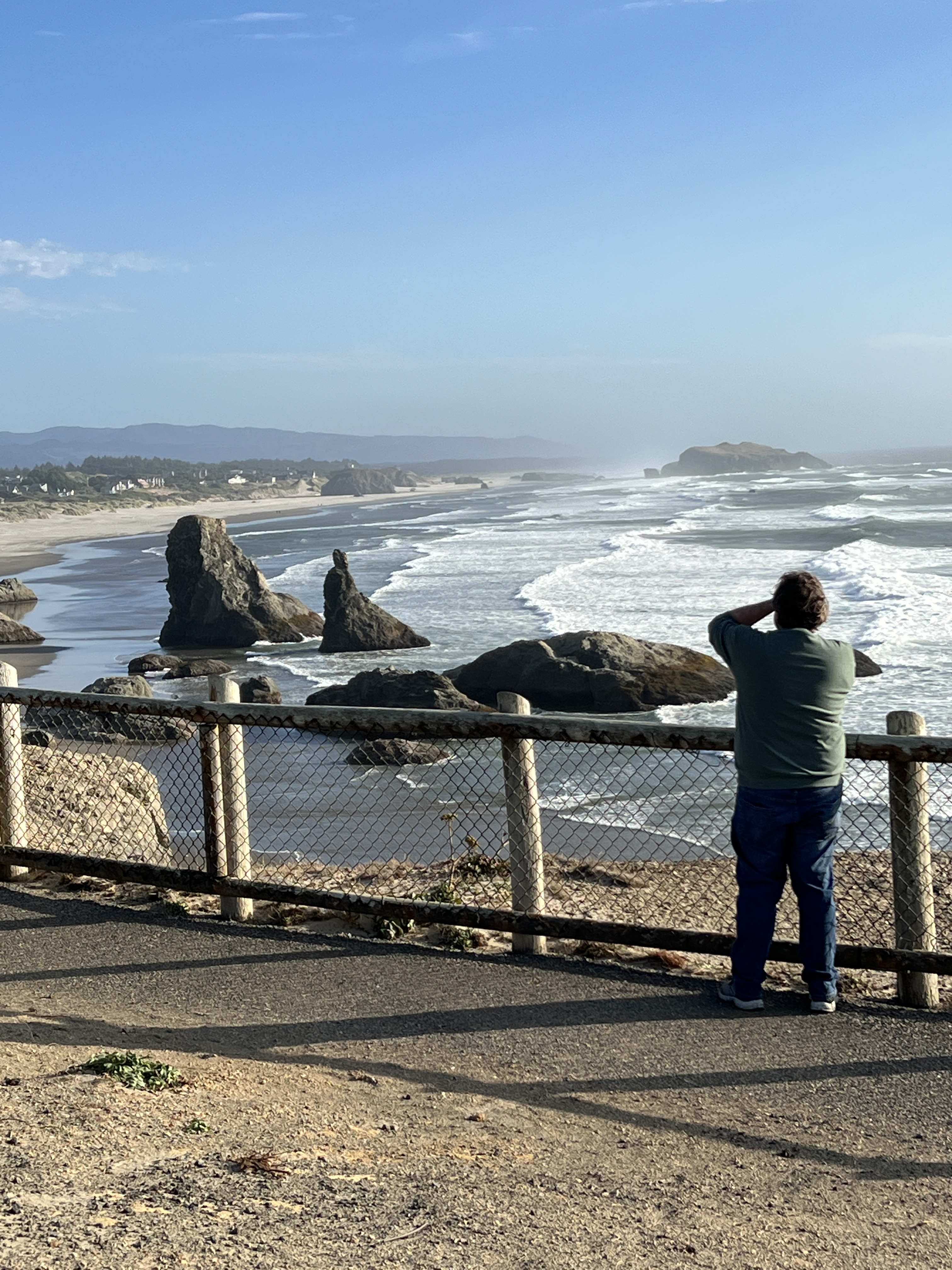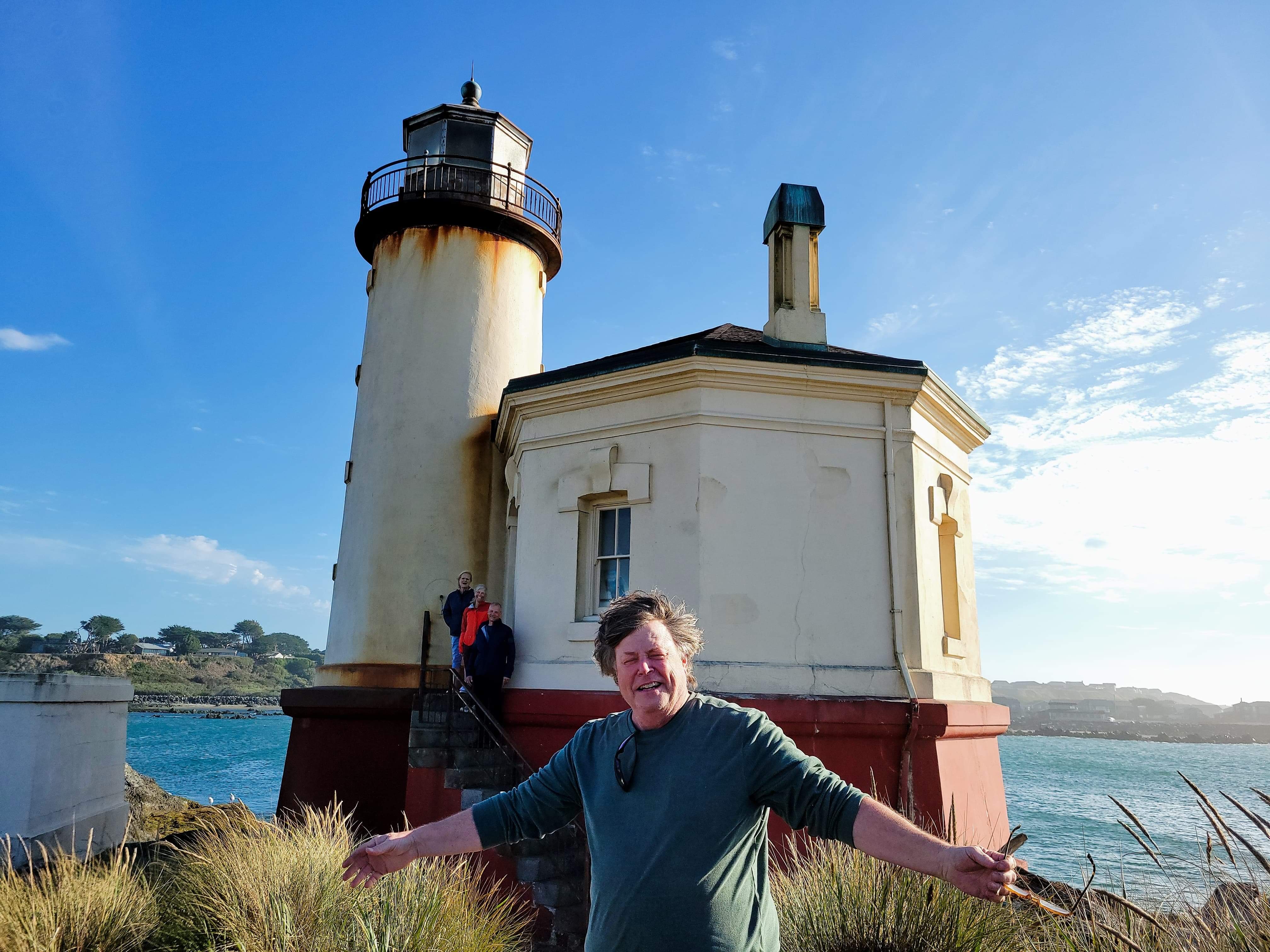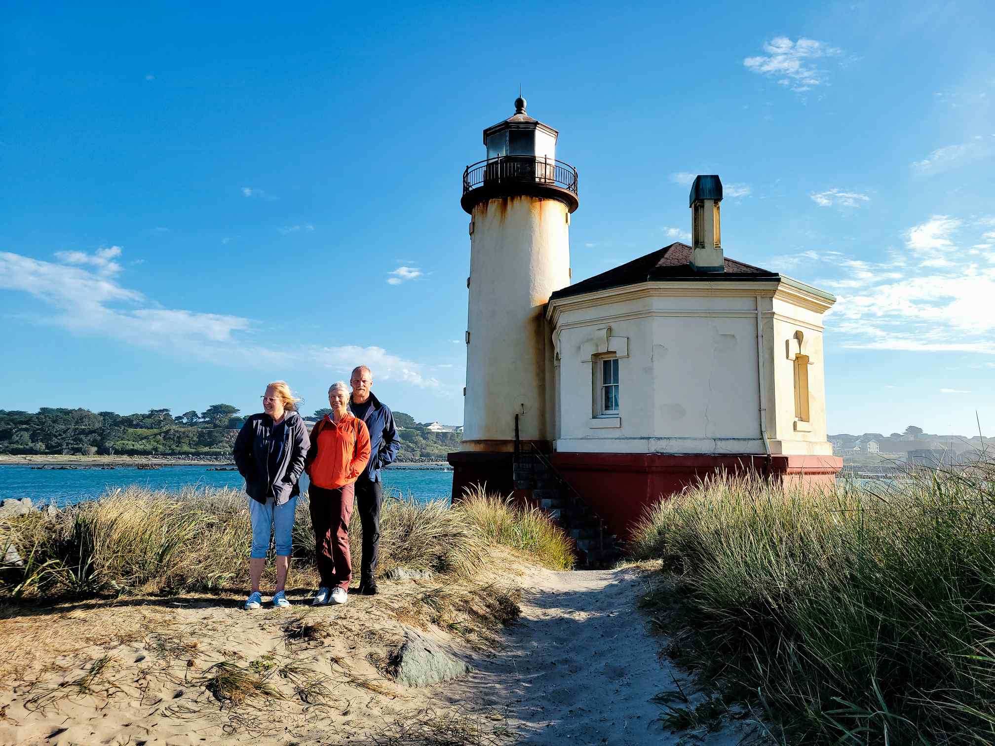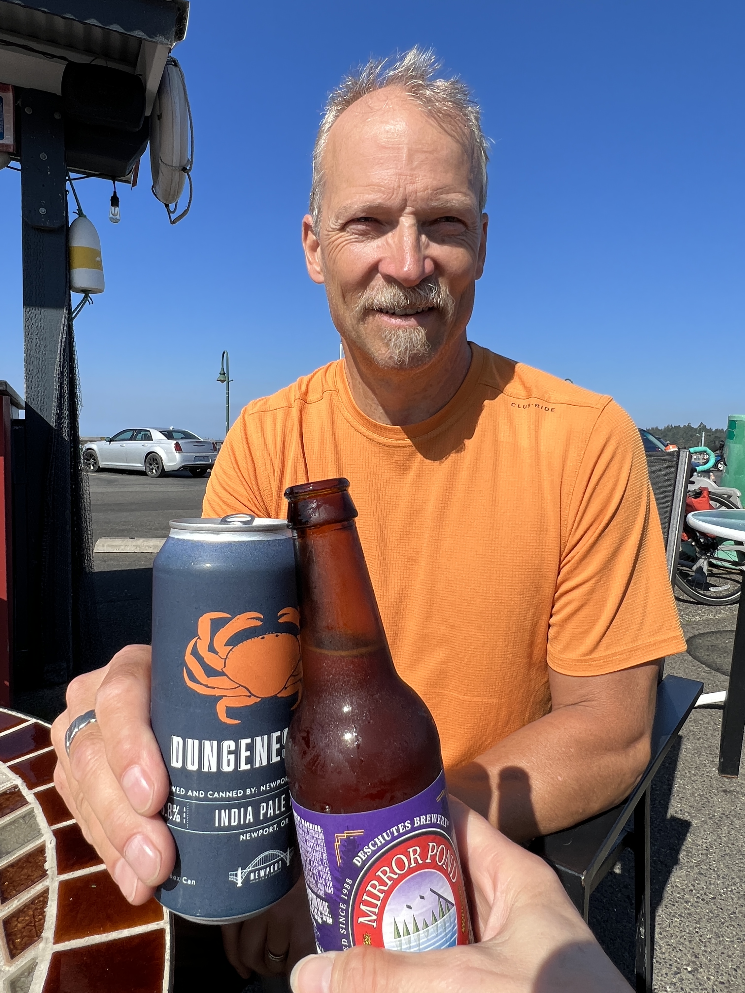 (Zero day) Bandon with Neal and Michele! Flowers for Grandma’s grave (Mom’s mom). Cheese and ice cream at Face Rock Creamery (Bandon Cheese Factory when we were young), Face Rock. Coquille Lighthouse. In the last picture Neal was hurrying to get into the picture with us on a timer setting and tripped, and he jumped up in time for the snap. All in all a beautiful albeit windy day in Mom’s hometown.