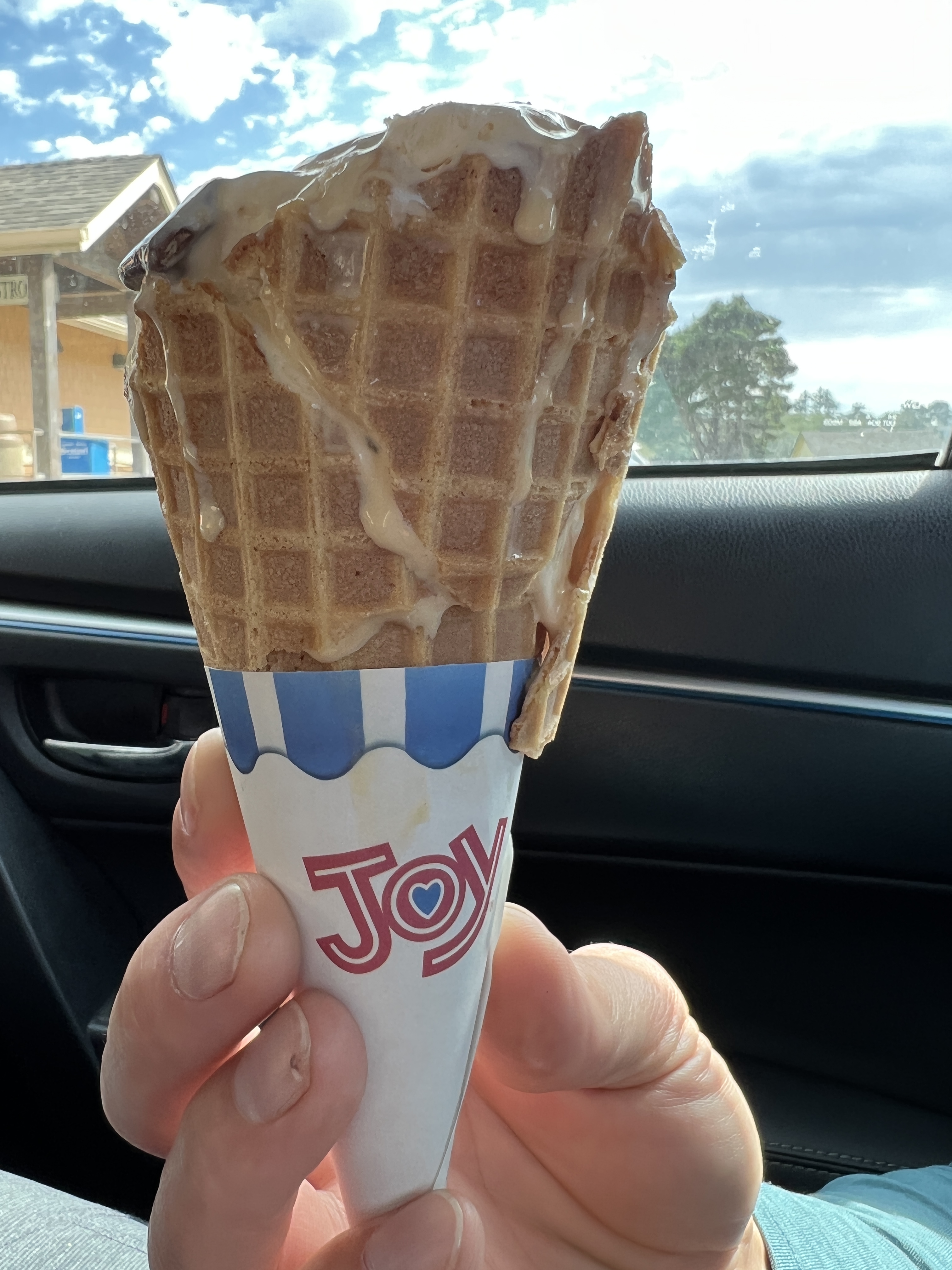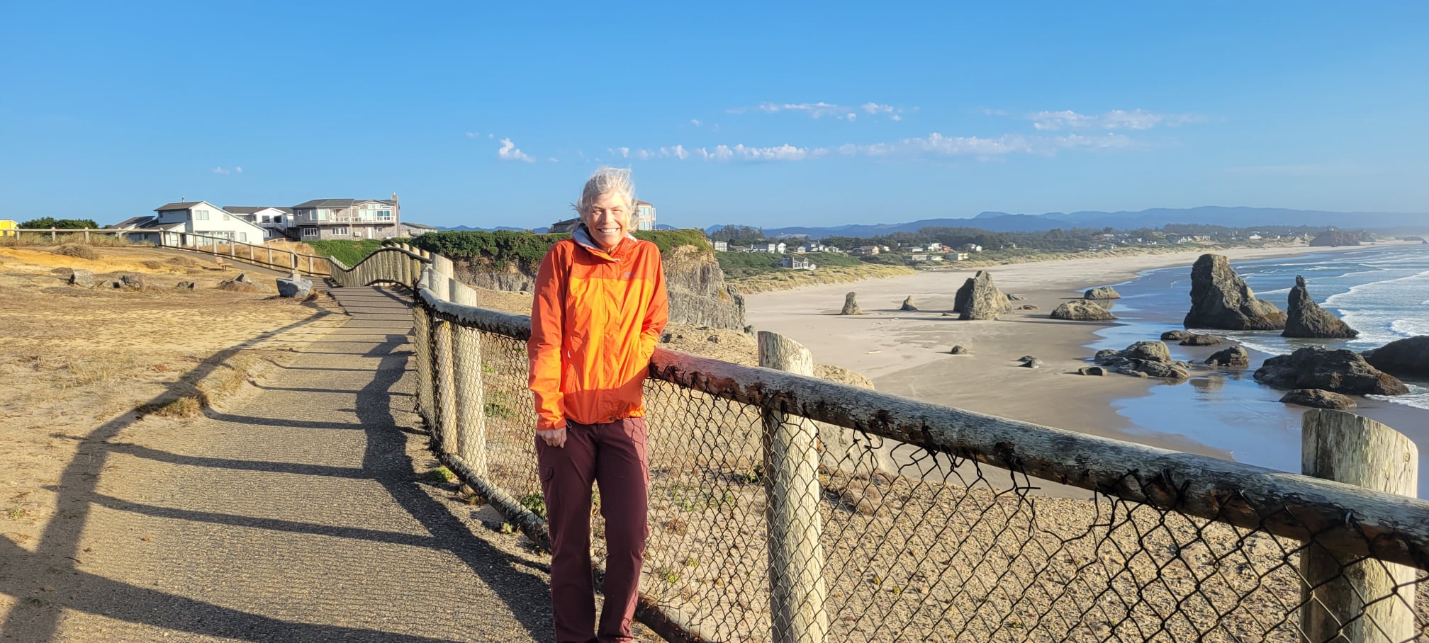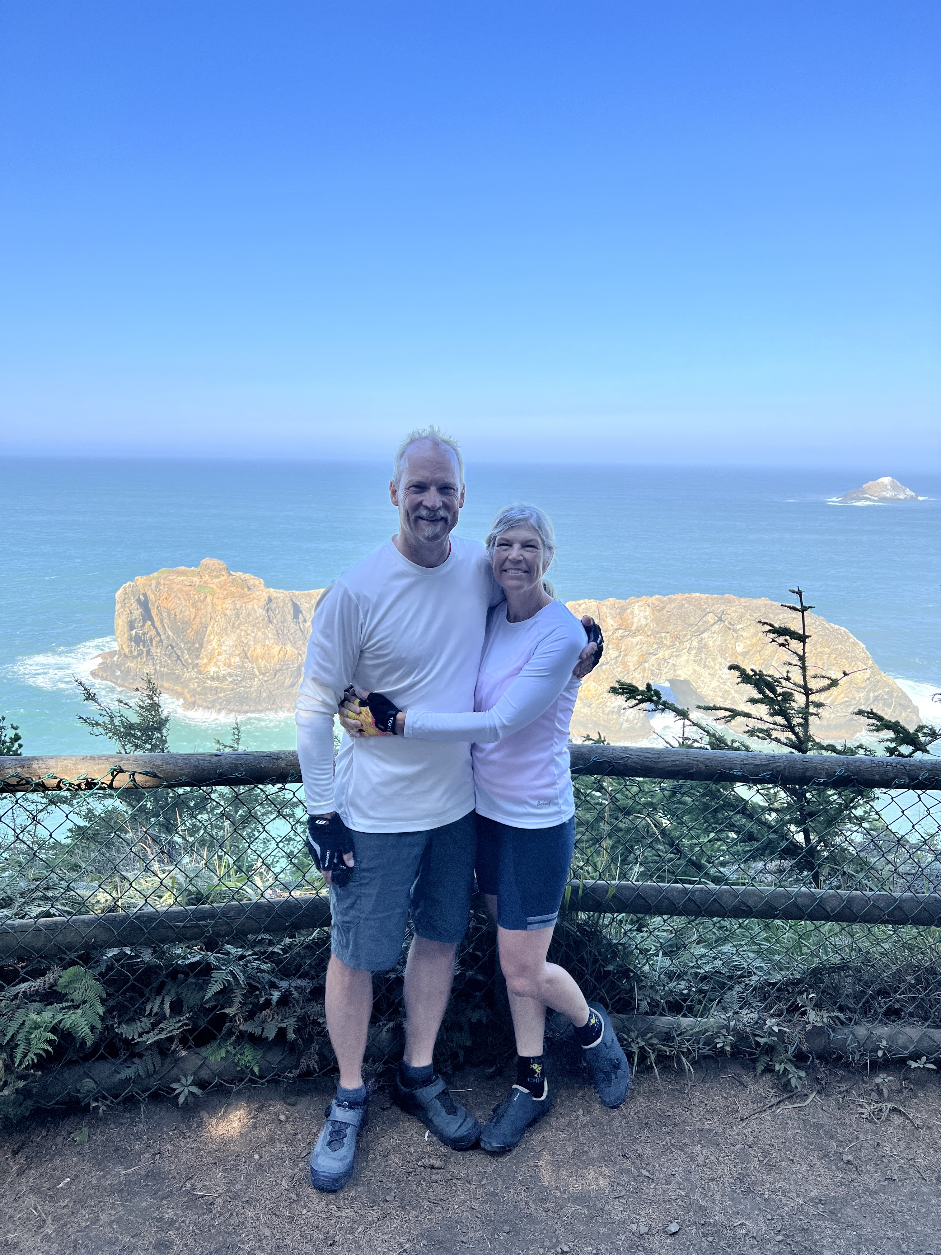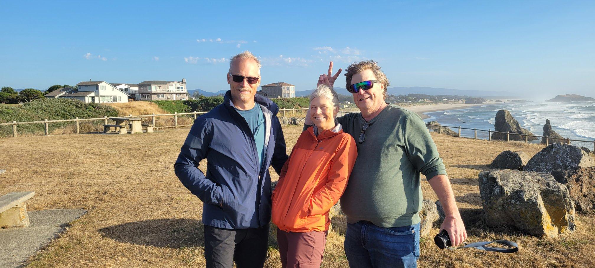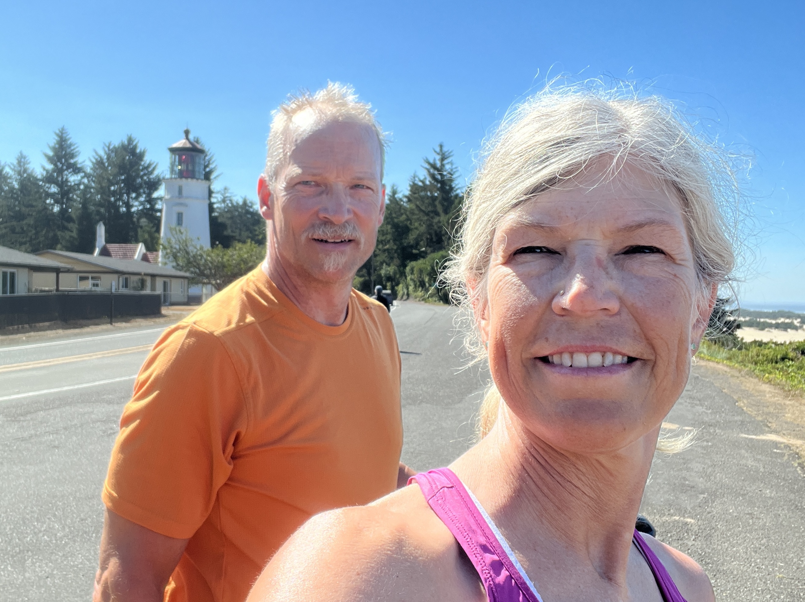 (Zero day) Bandon with Neal and Michele! Flowers for Grandma’s grave (Mom’s mom). Cheese and ice cream at Face Rock Creamery (Bandon Cheese Factory when we were young), Face Rock. Coquille Lighthouse. In the last picture Neal was hurrying to get into the picture with us on a timer setting and tripped, and he jumped up in time for the snap. All in all a beautiful albeit windy day in Mom’s hometown.
