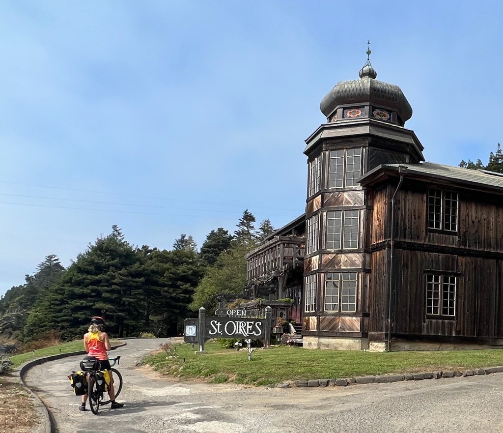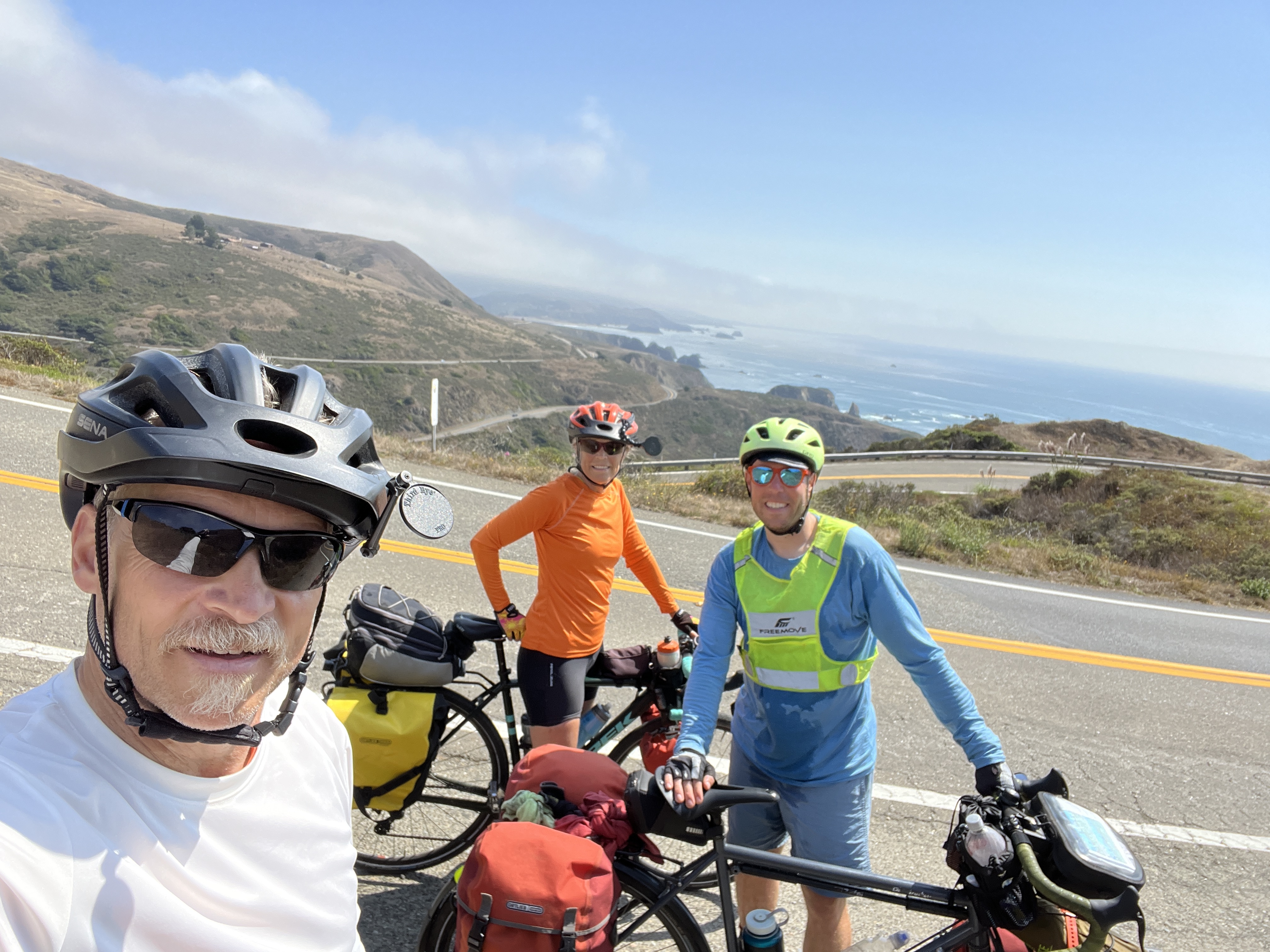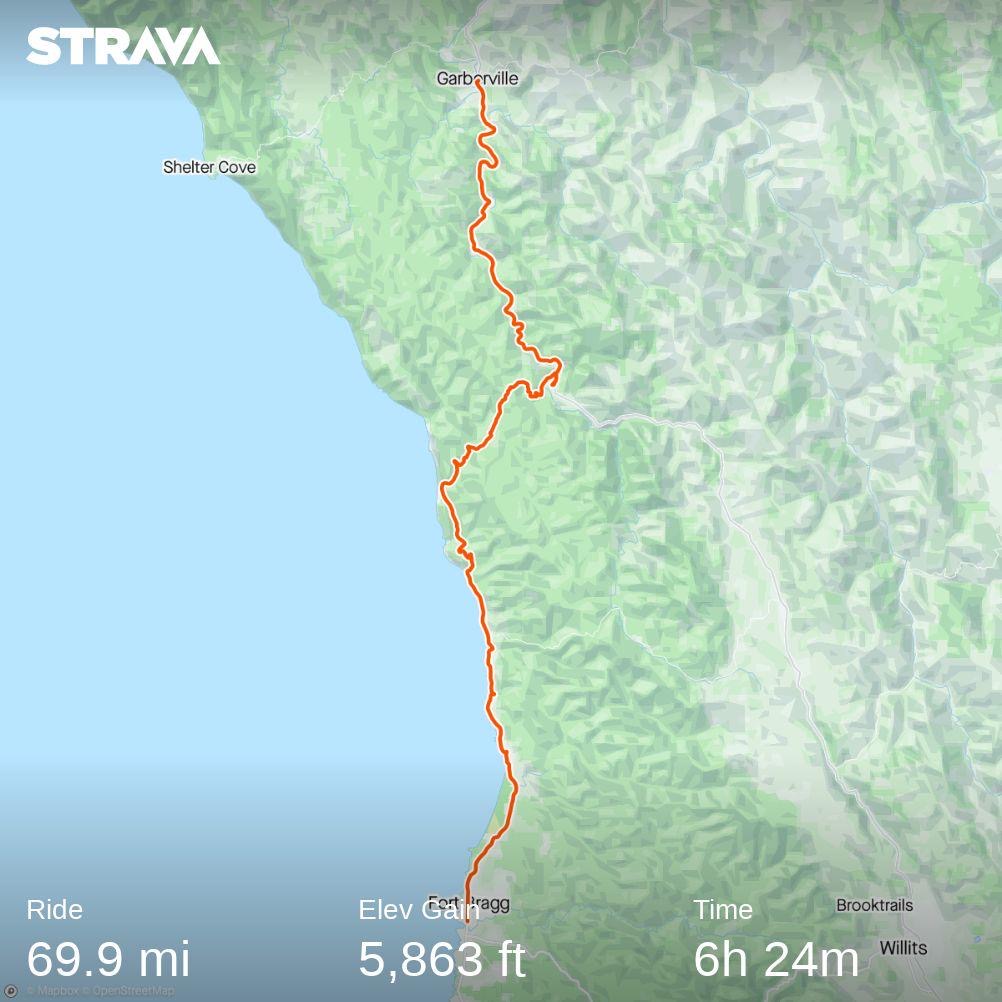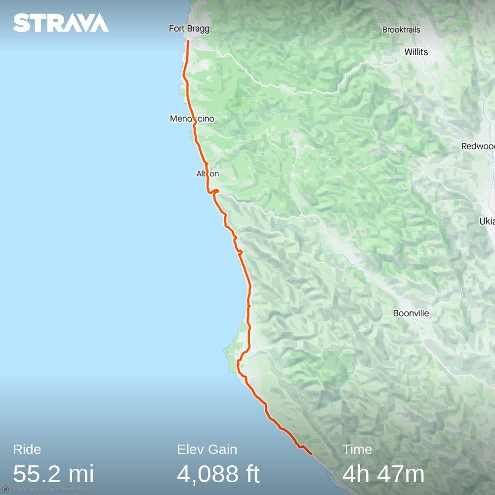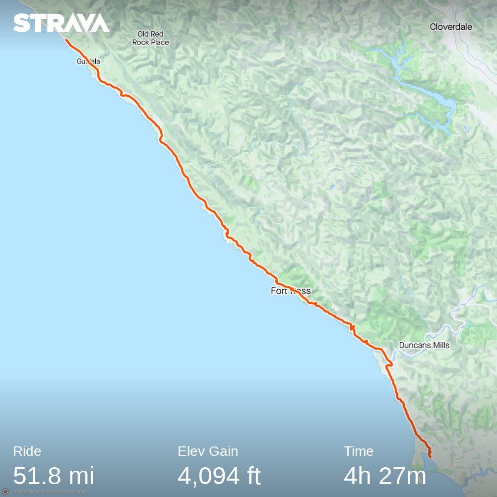 Fort Bragg hotel to St Orres cabin. Scary climbs and beautiful views. Fog to sun.