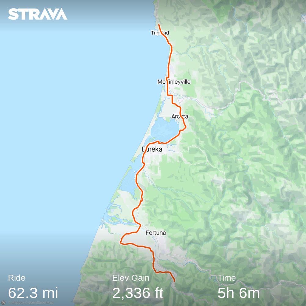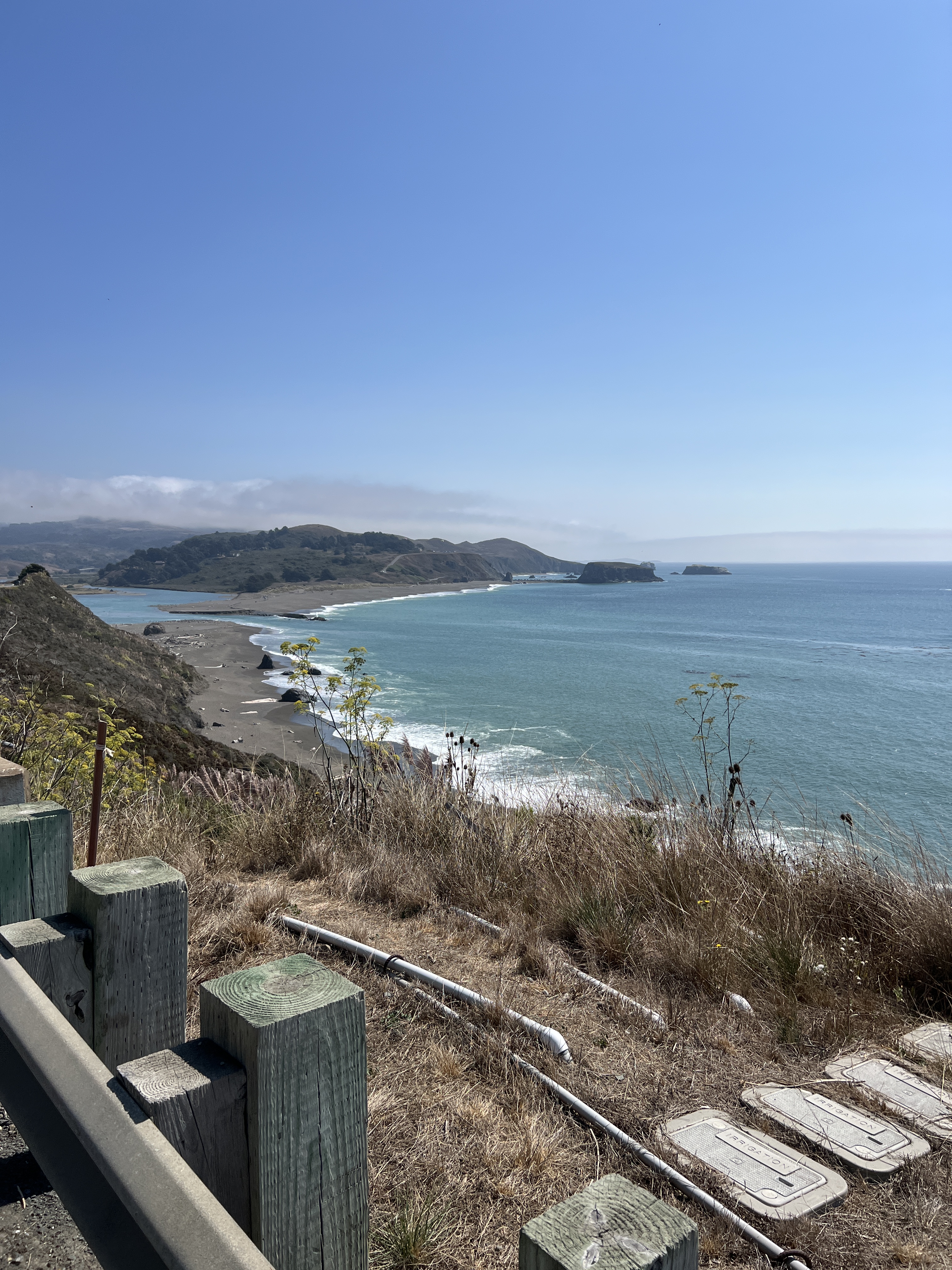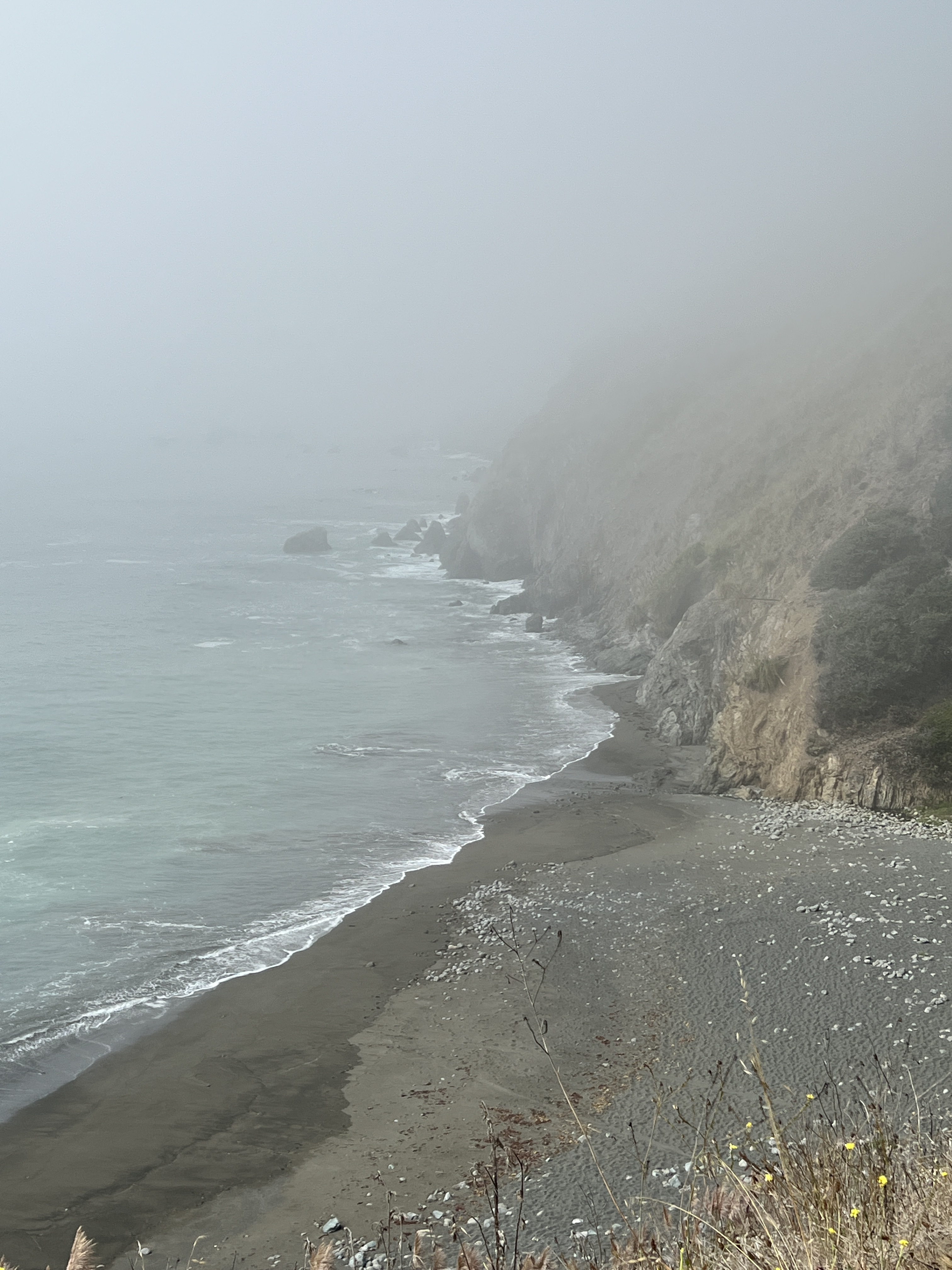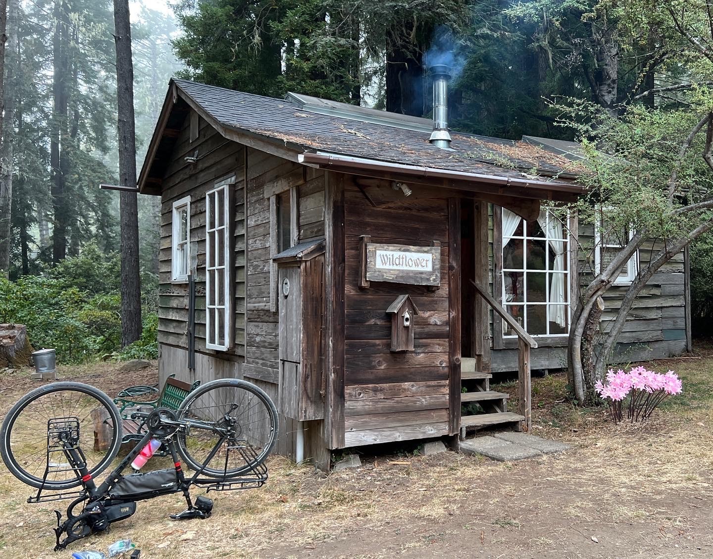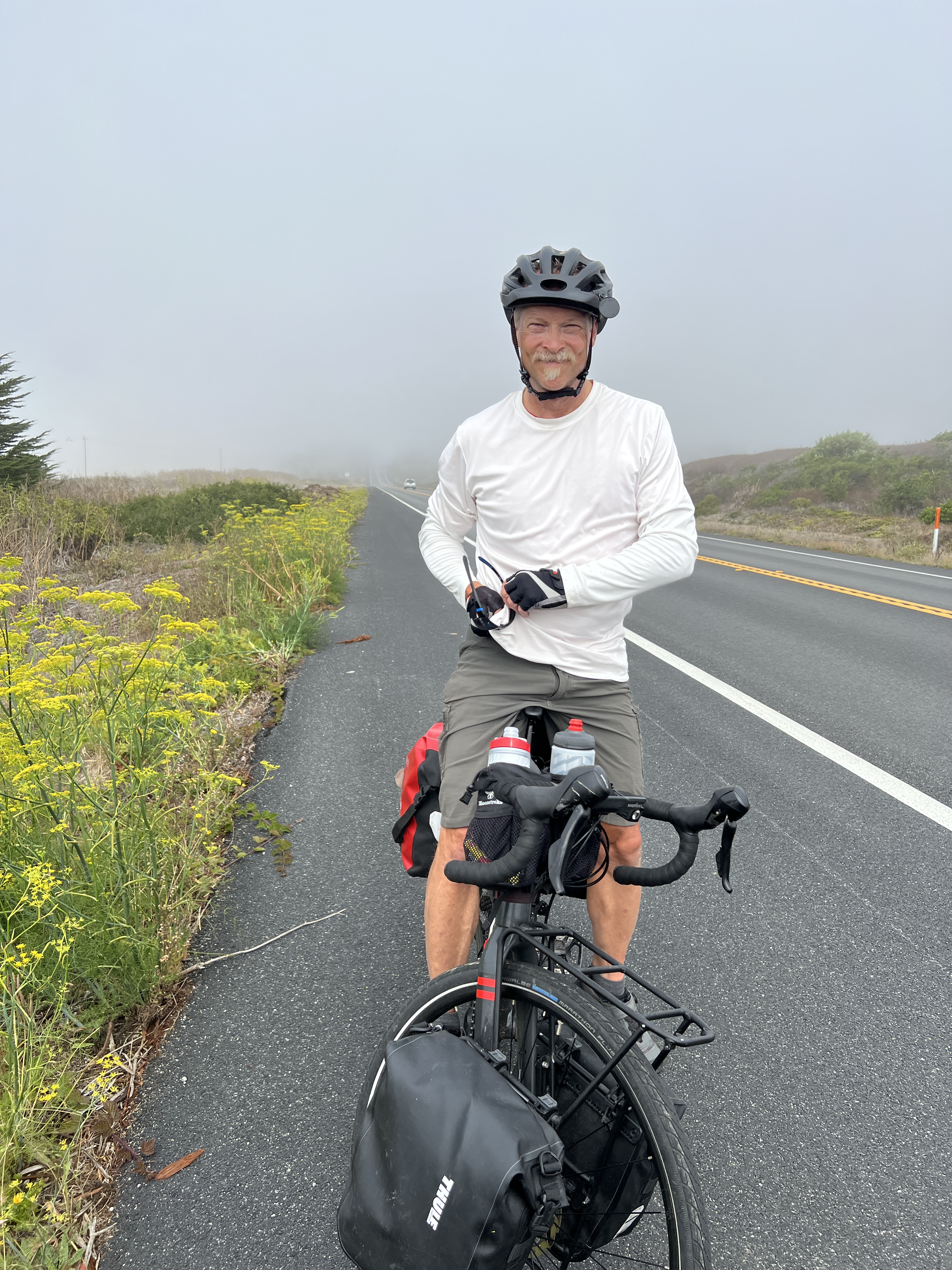 Fort Bragg hotel to St Orres cabin. Scary climbs and beautiful views. Fog to sun.