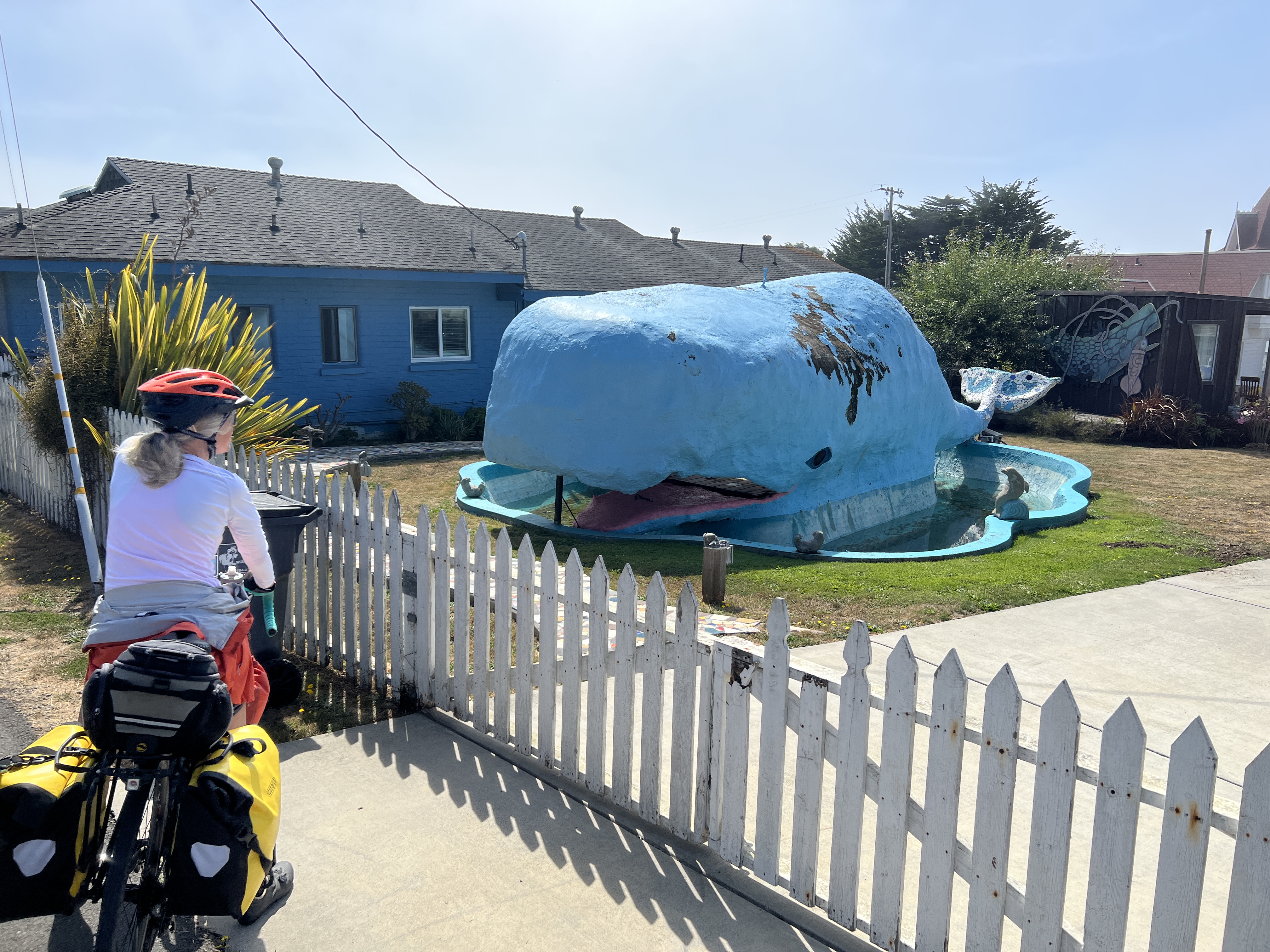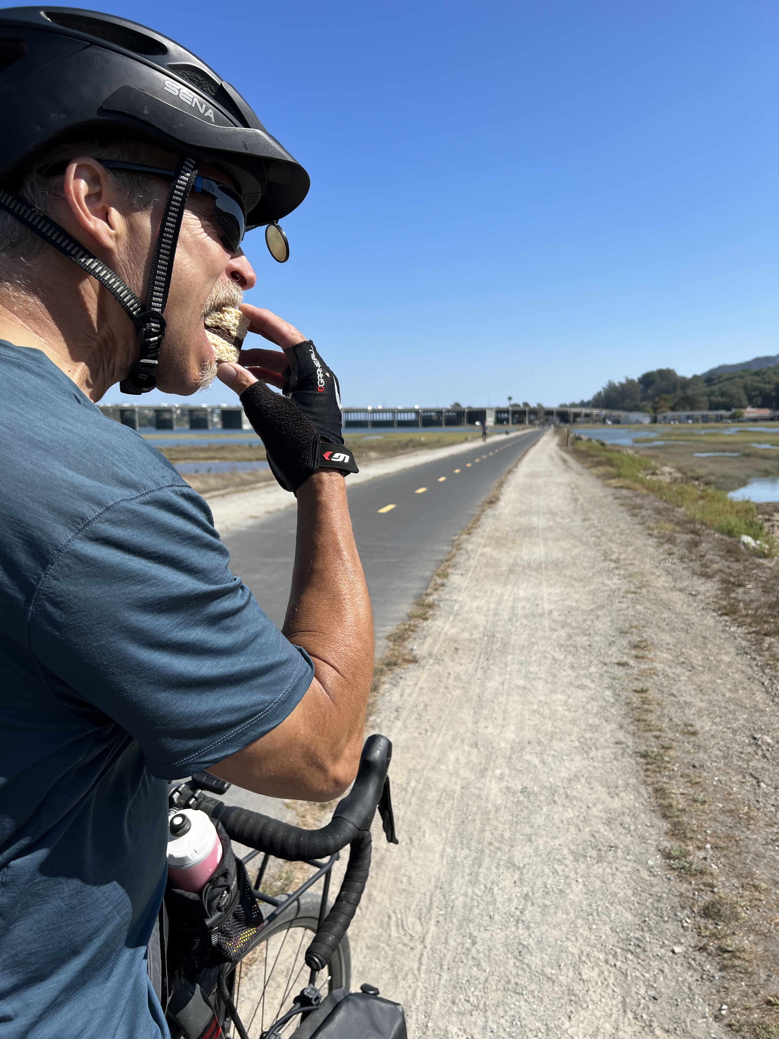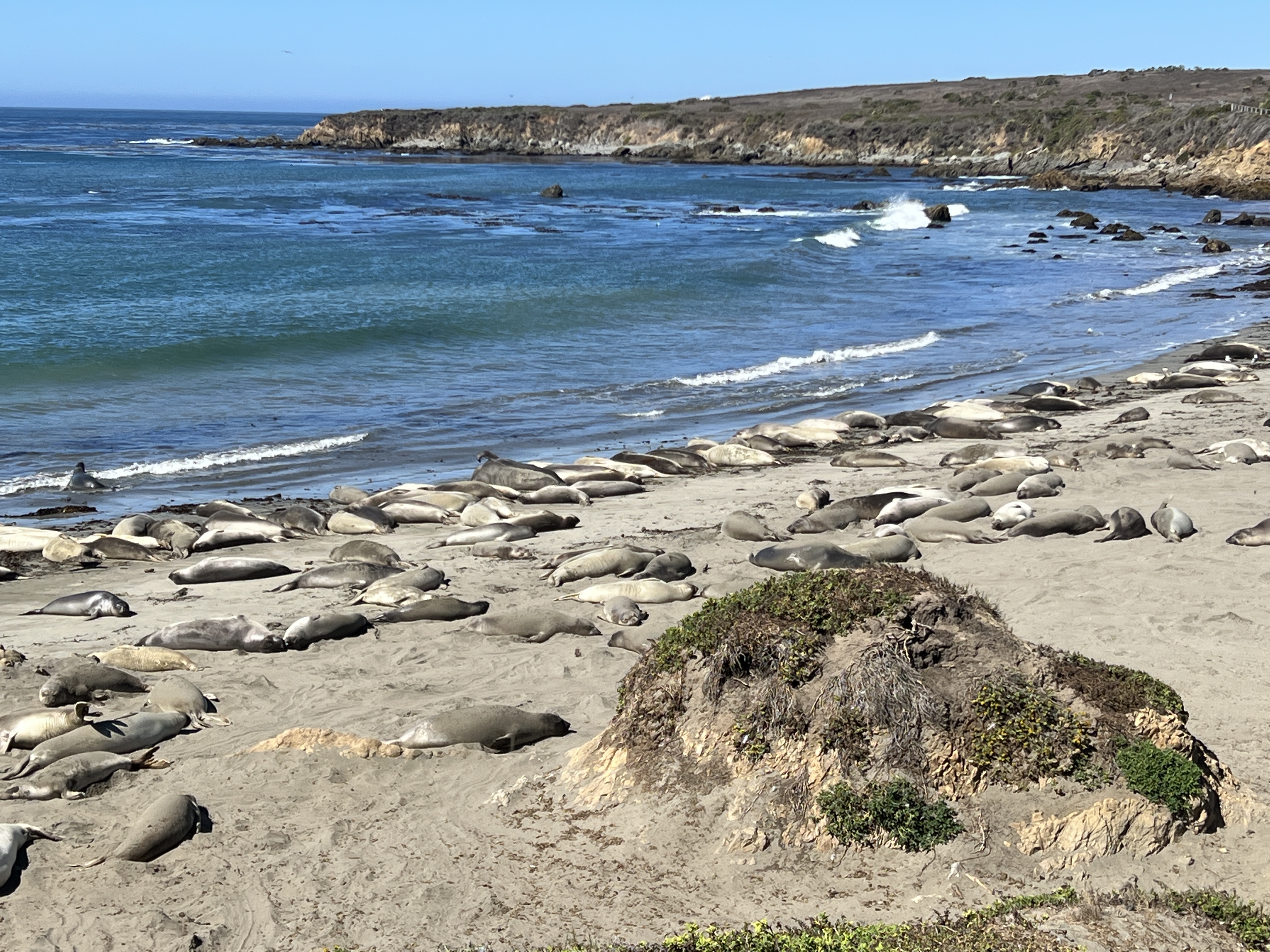 Brilliant breakfast. Leaving our excellent Warmshowers host, Murdock, (and our 49ers room). Elephant seals near San Simeon. Morro Bay. Pearls from Craig’s fried oysters.