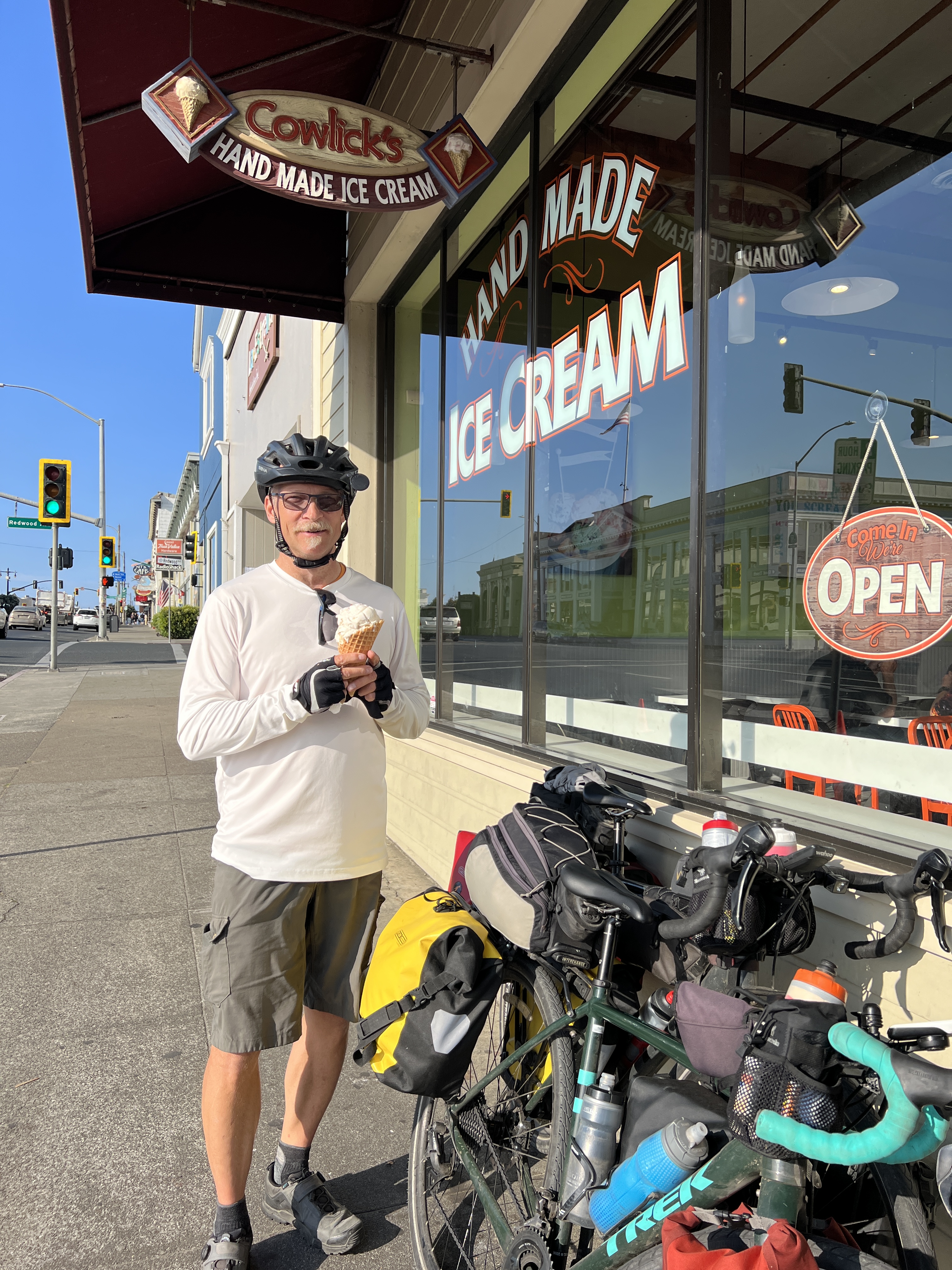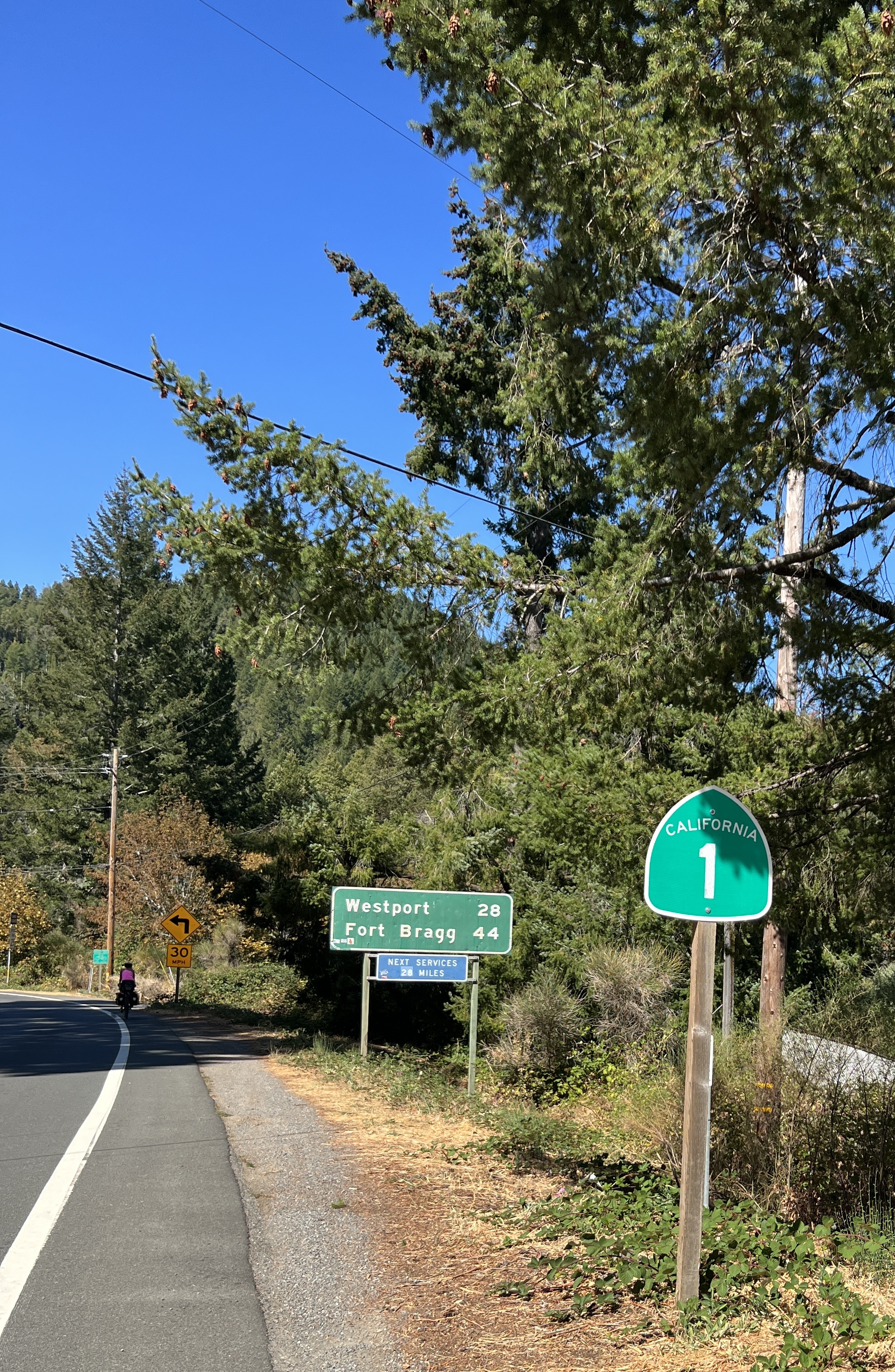 Garberville to Fort Bragg. Back roads with wild fennel. Last drive thru tree. Abandoning 101 for Highway 1. Beer, pizza, and ice cream in Fort Bragg.