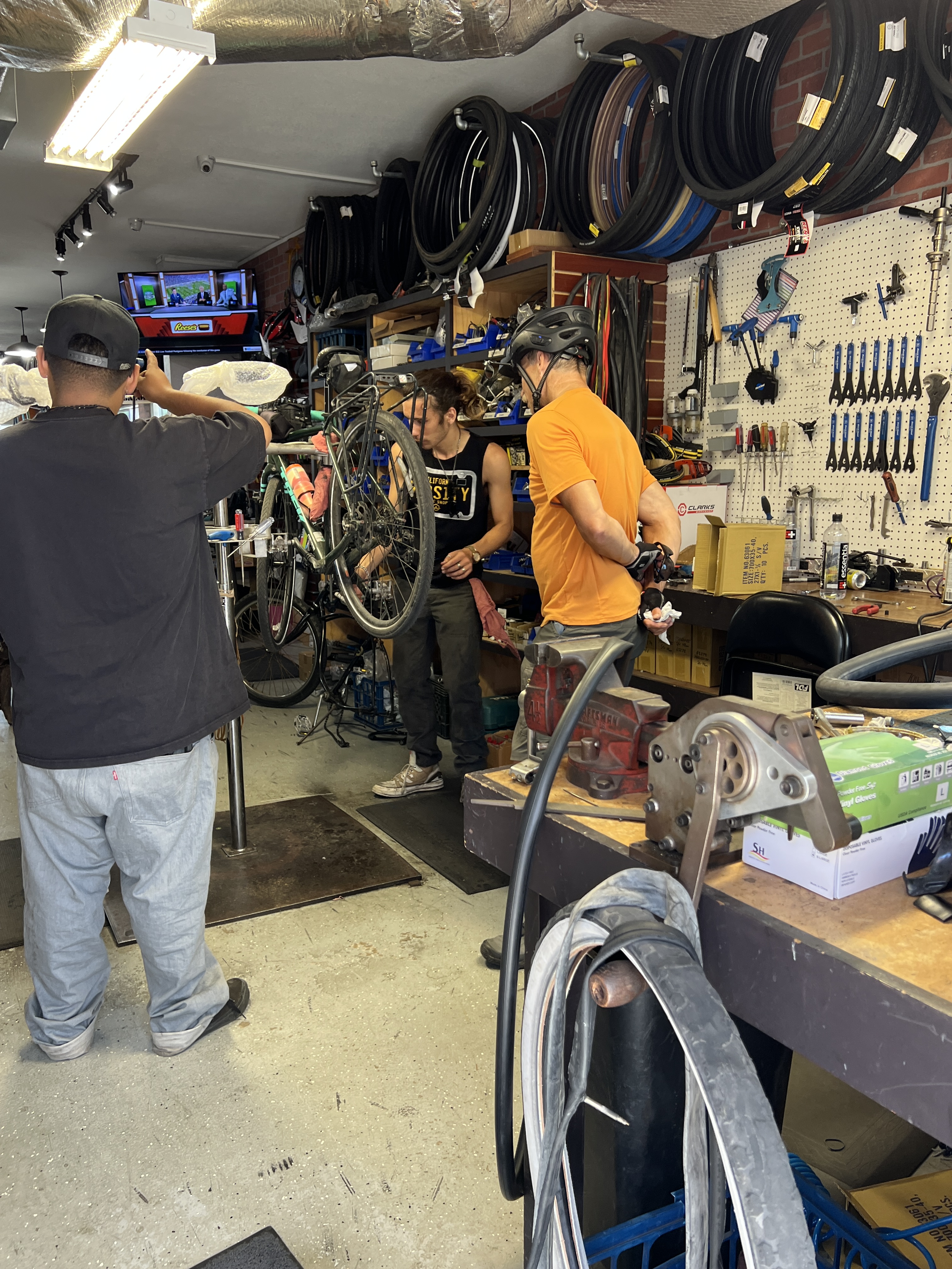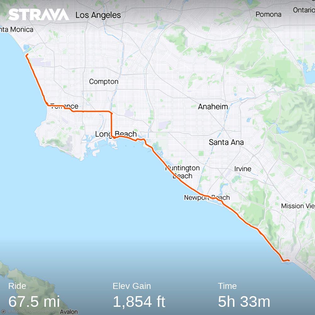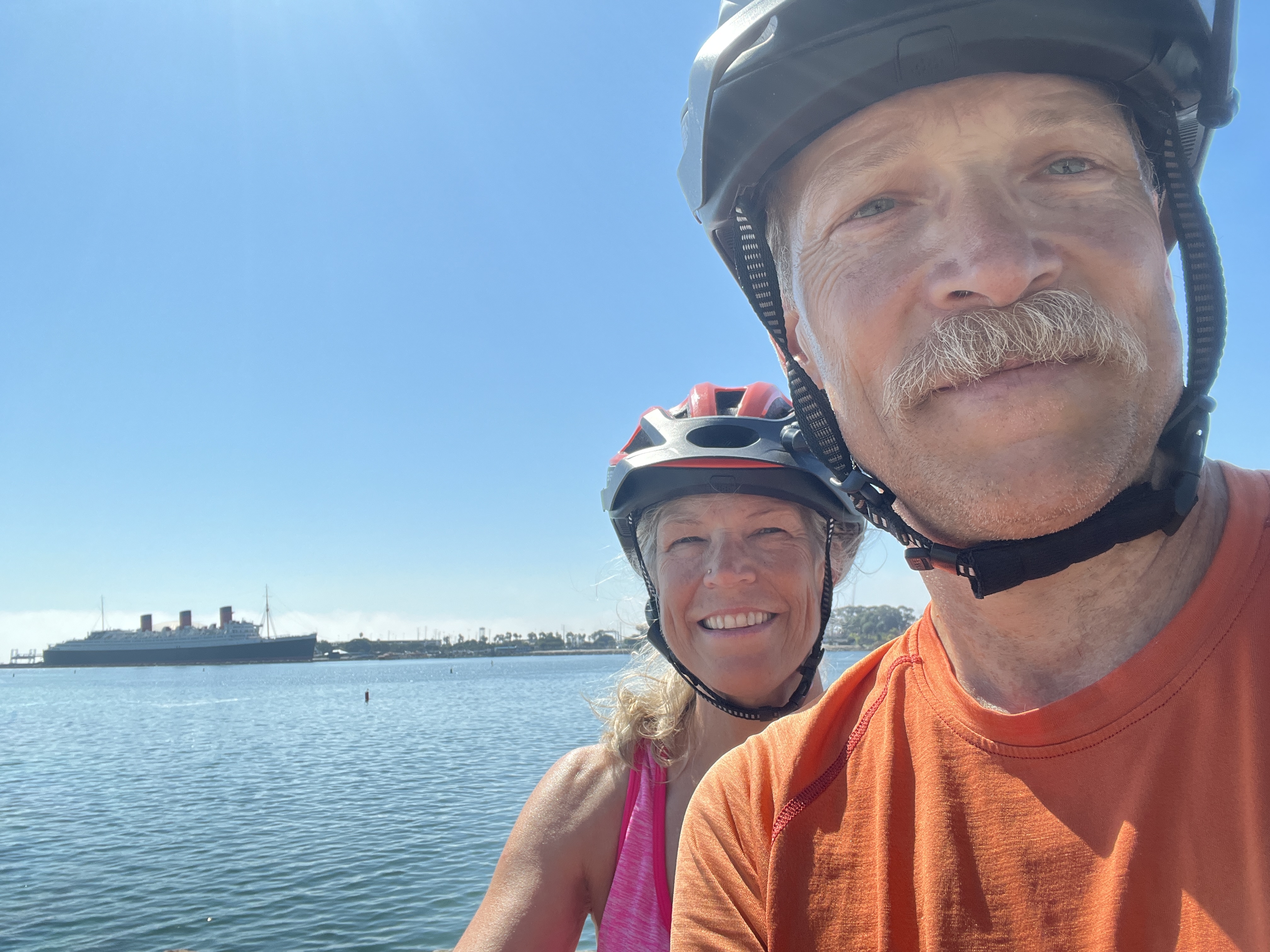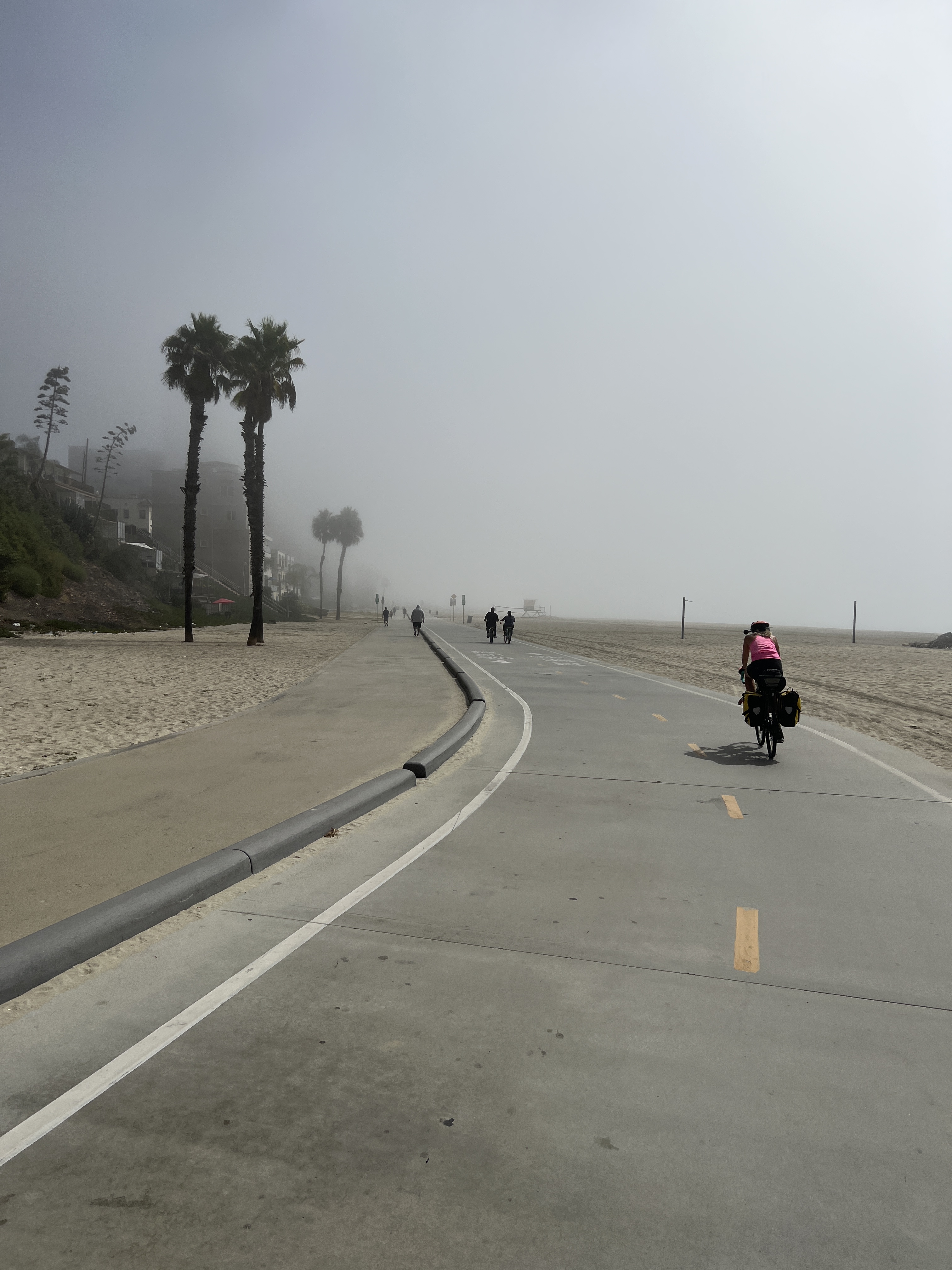 Lots of fog, trails, and some highway. Los Angeles River Trail. Long Beach and the Queen Mary. The bike shop 0.6 miles from where I snapped a cable. Excellent dinner in Dana Point.