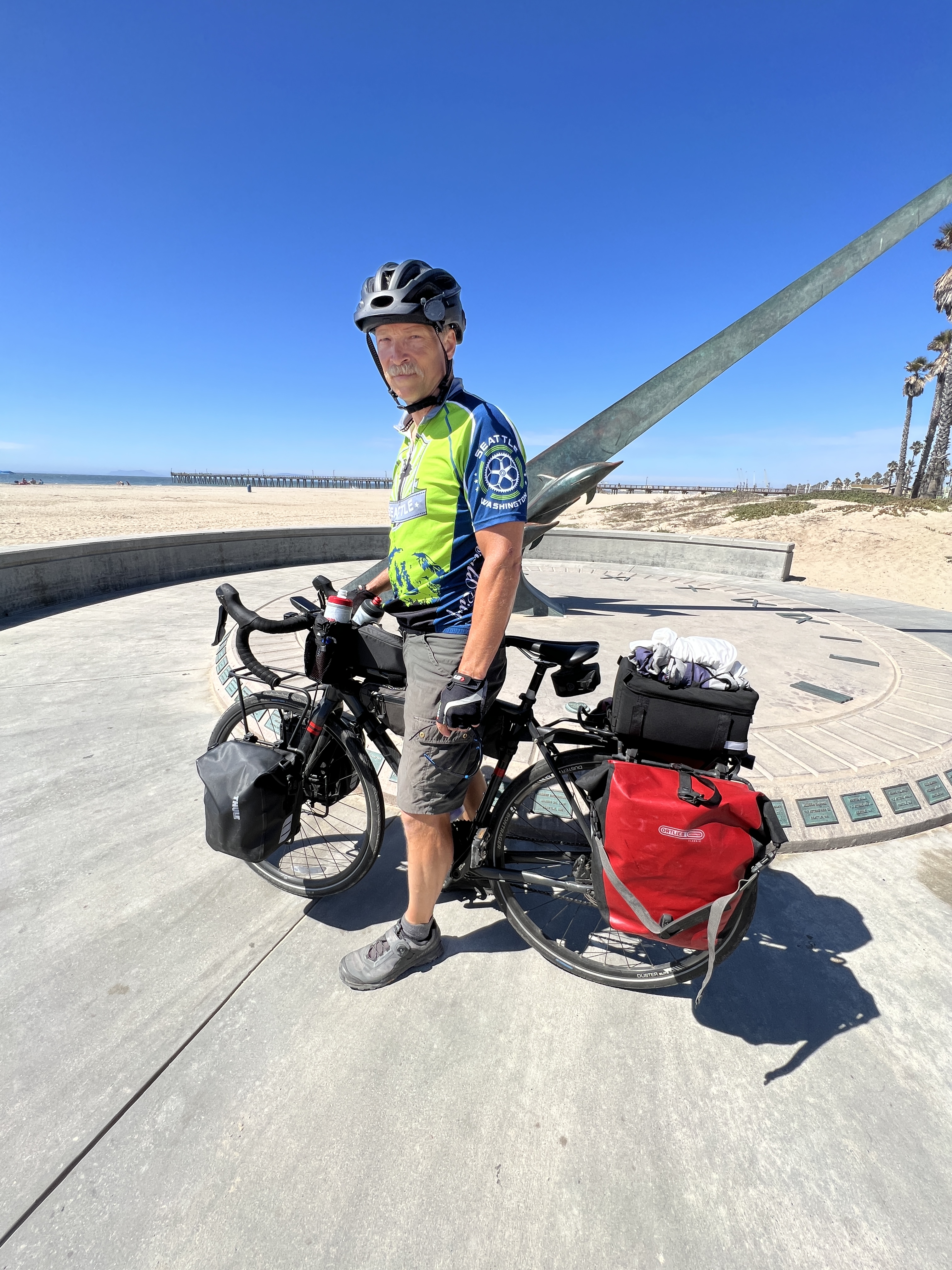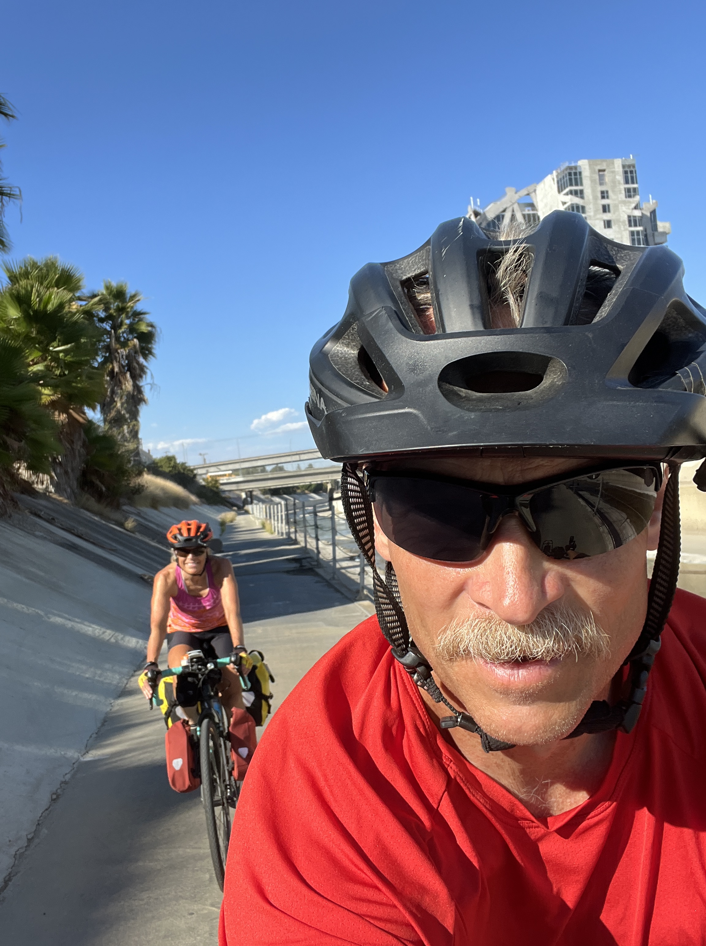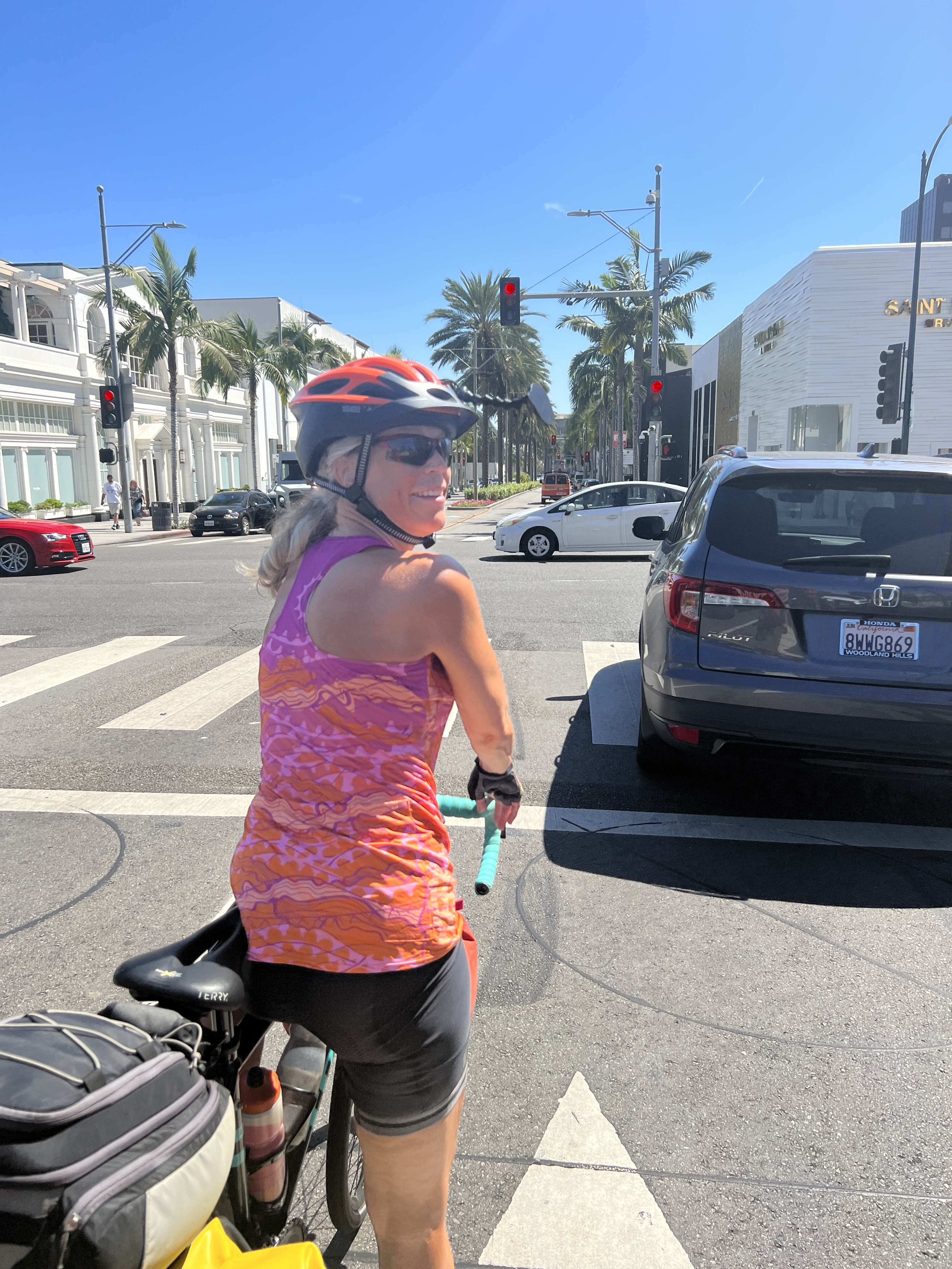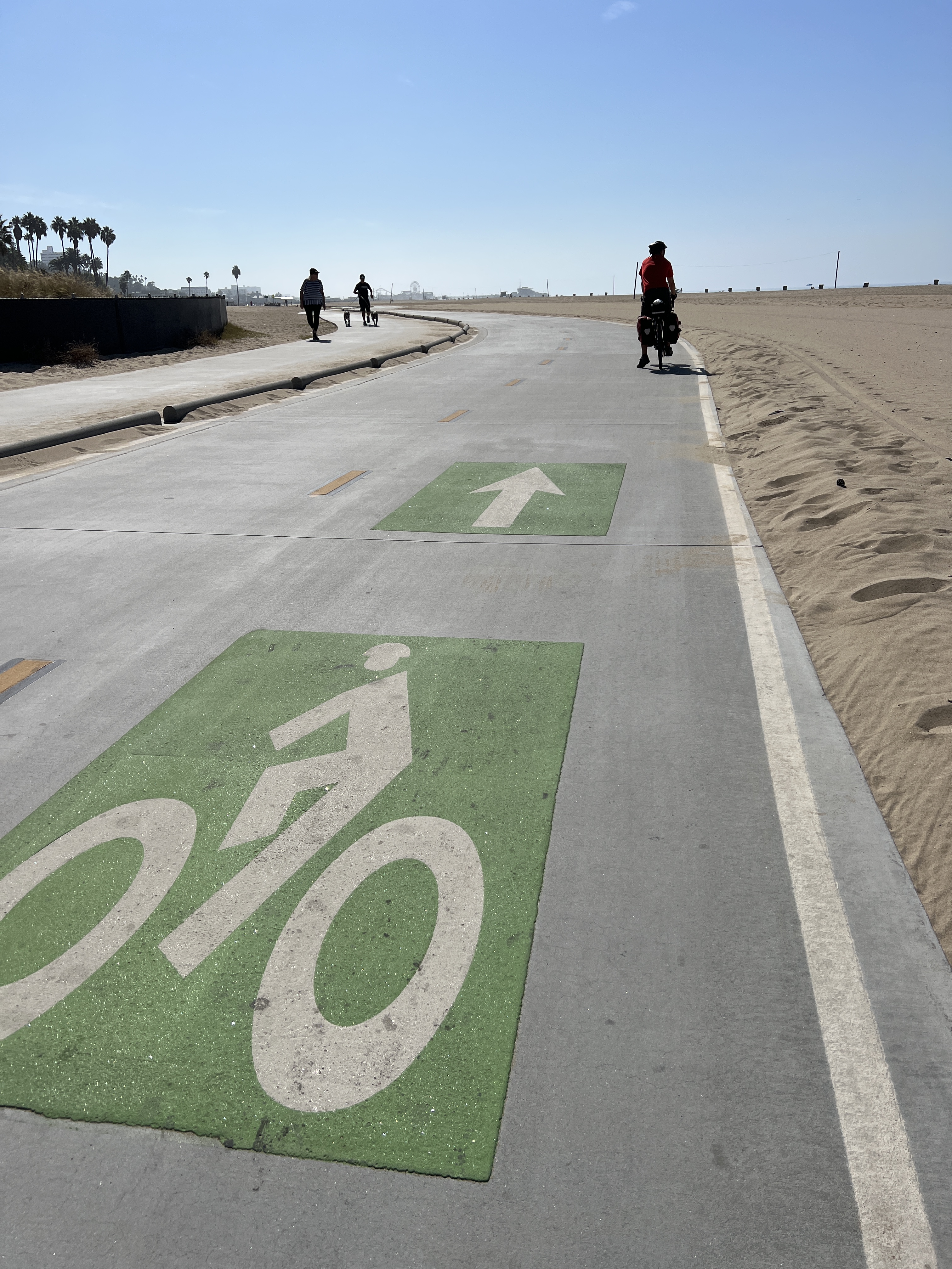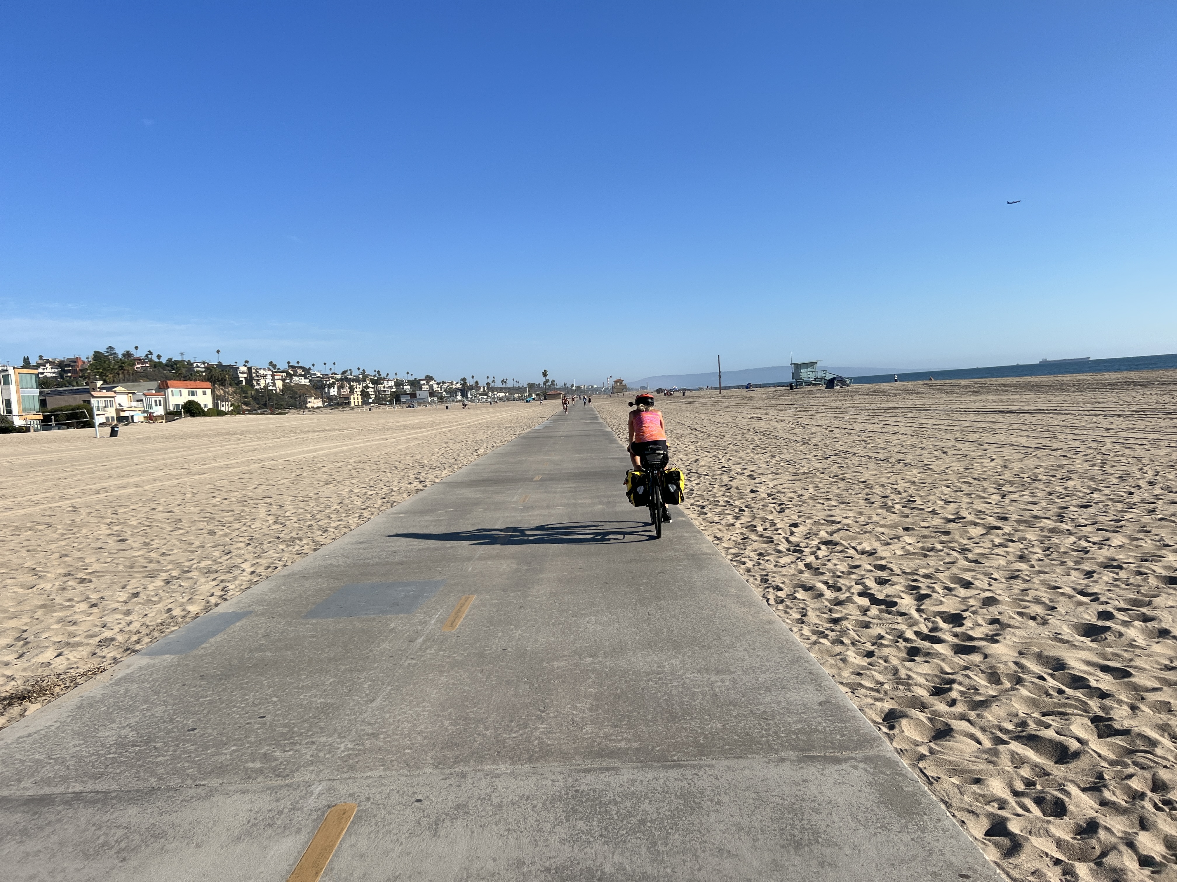 Pesky flat. Beach trail through Santa Monica and into Venice. Google and Donovan. Bradley (near UCLA). Aileen at USC. Me looking back on Rodeo Drive. Ballona Creek Bike Path. Cocktail hour and dinner.