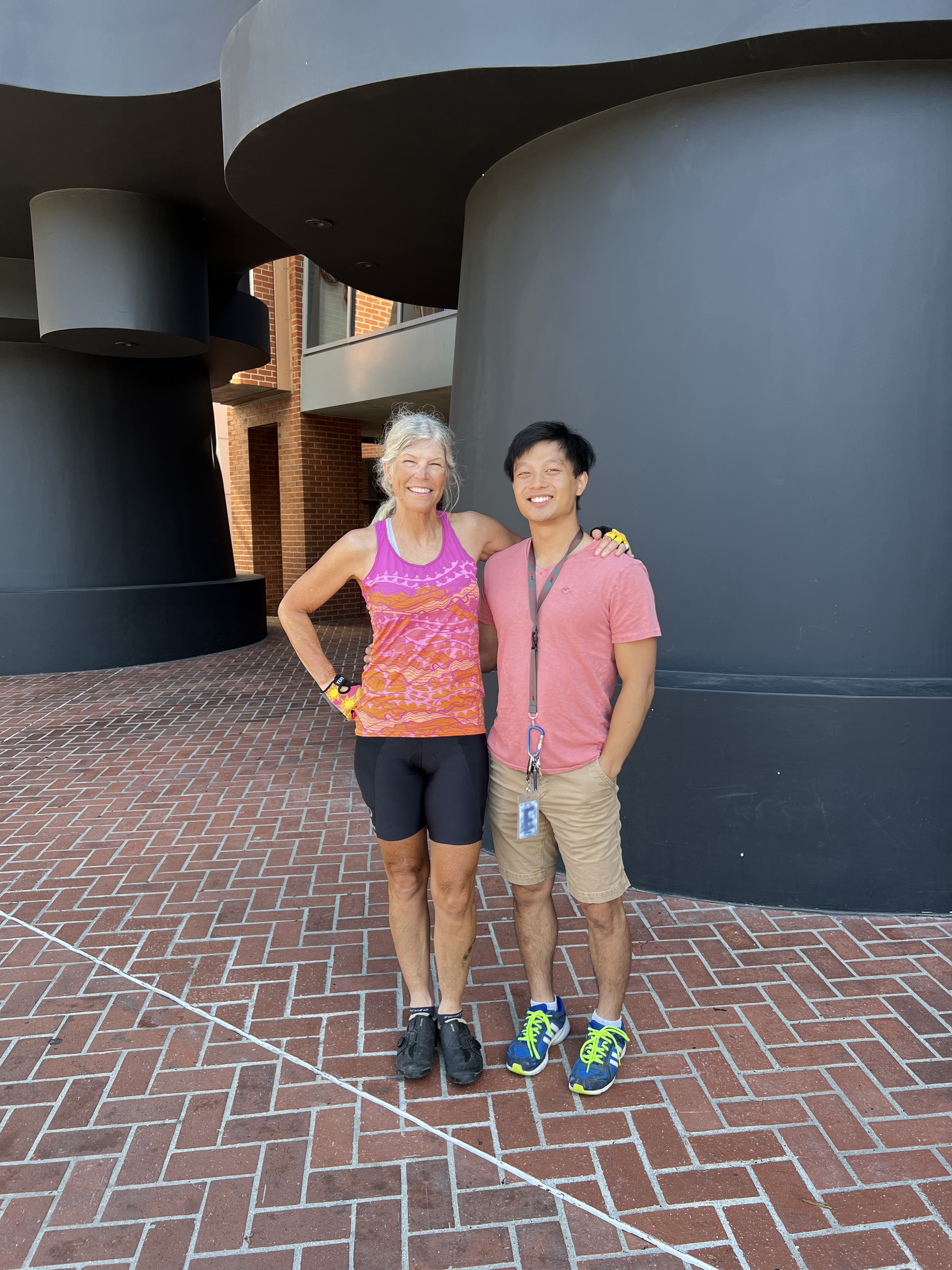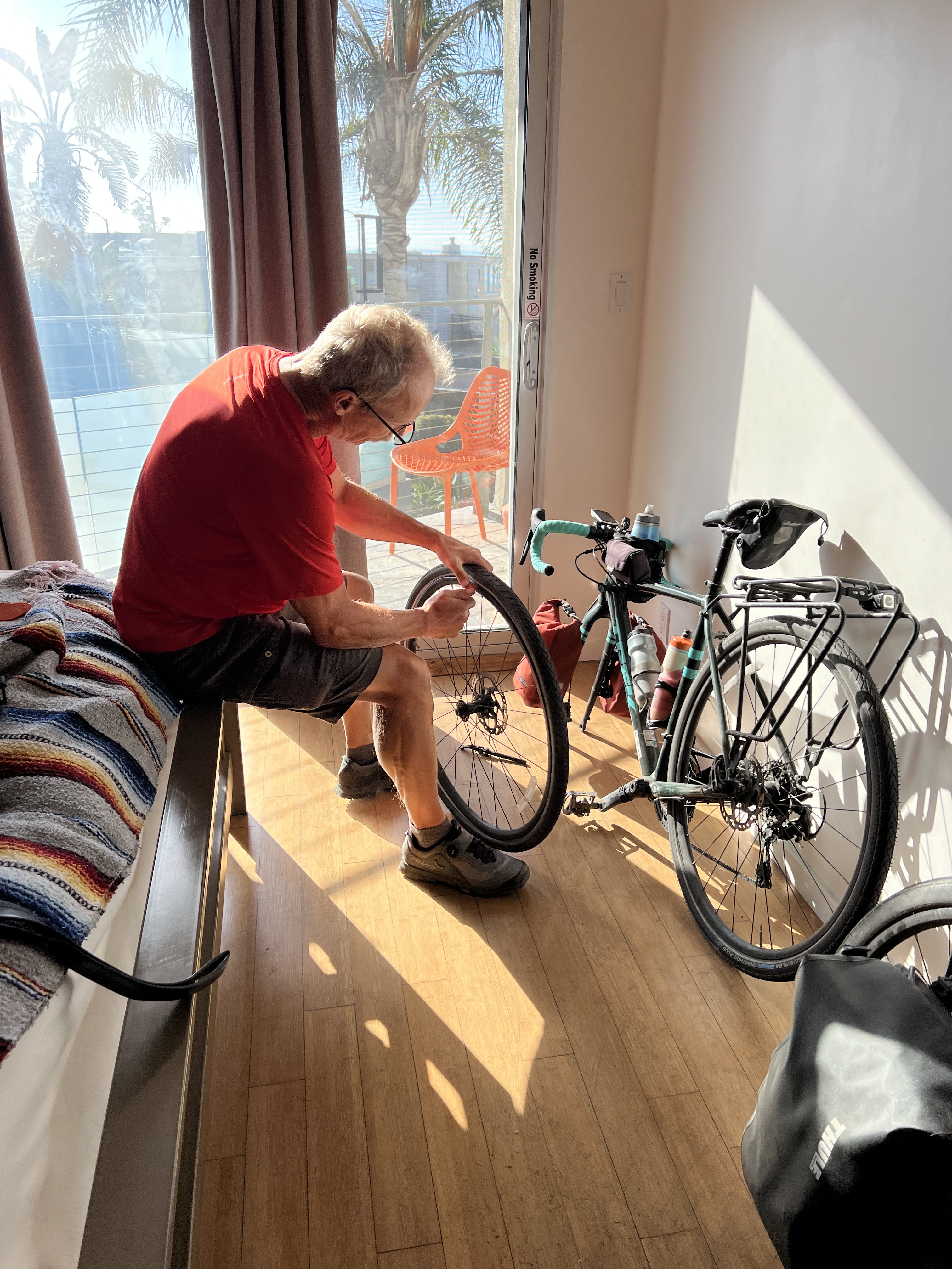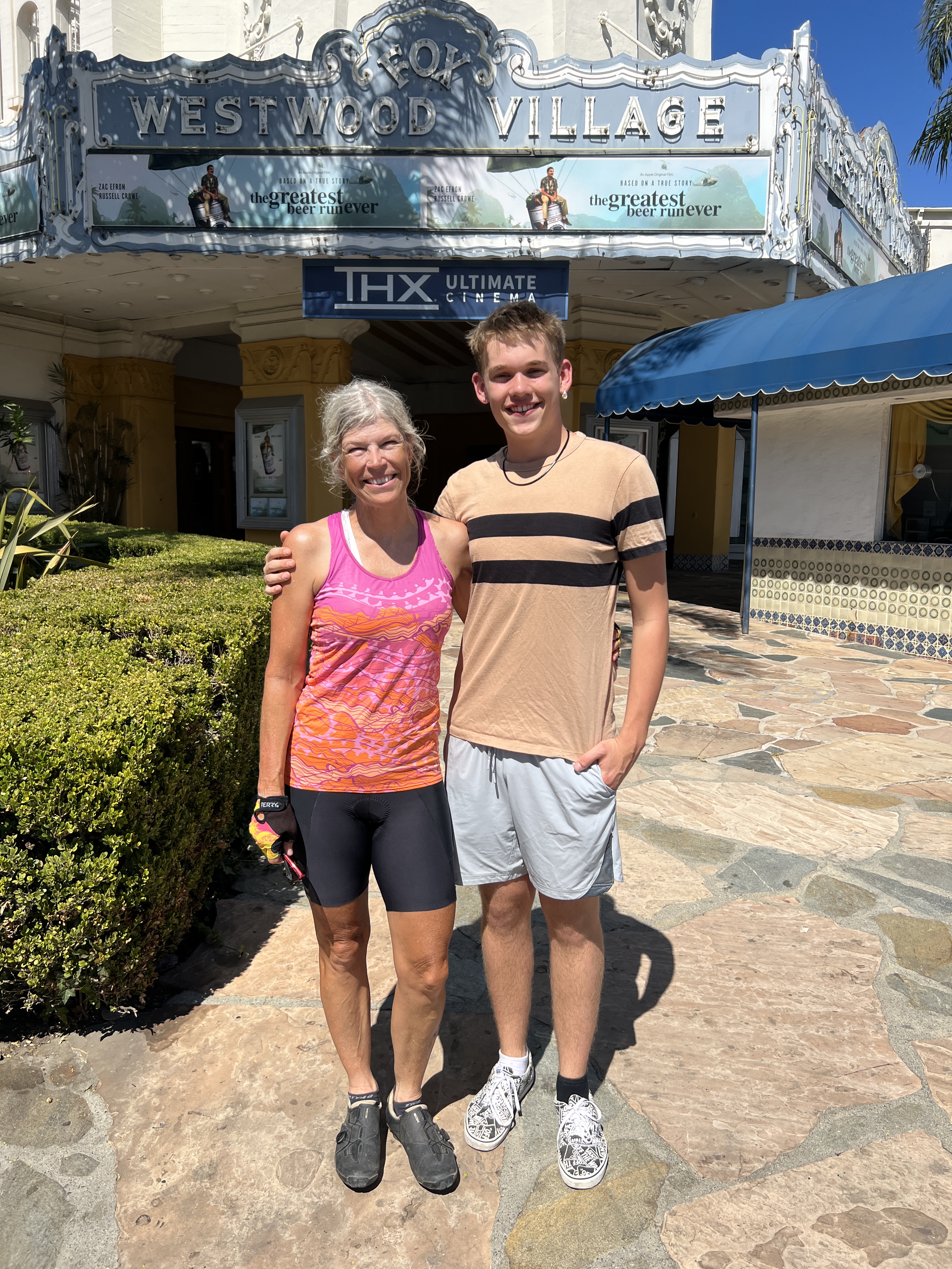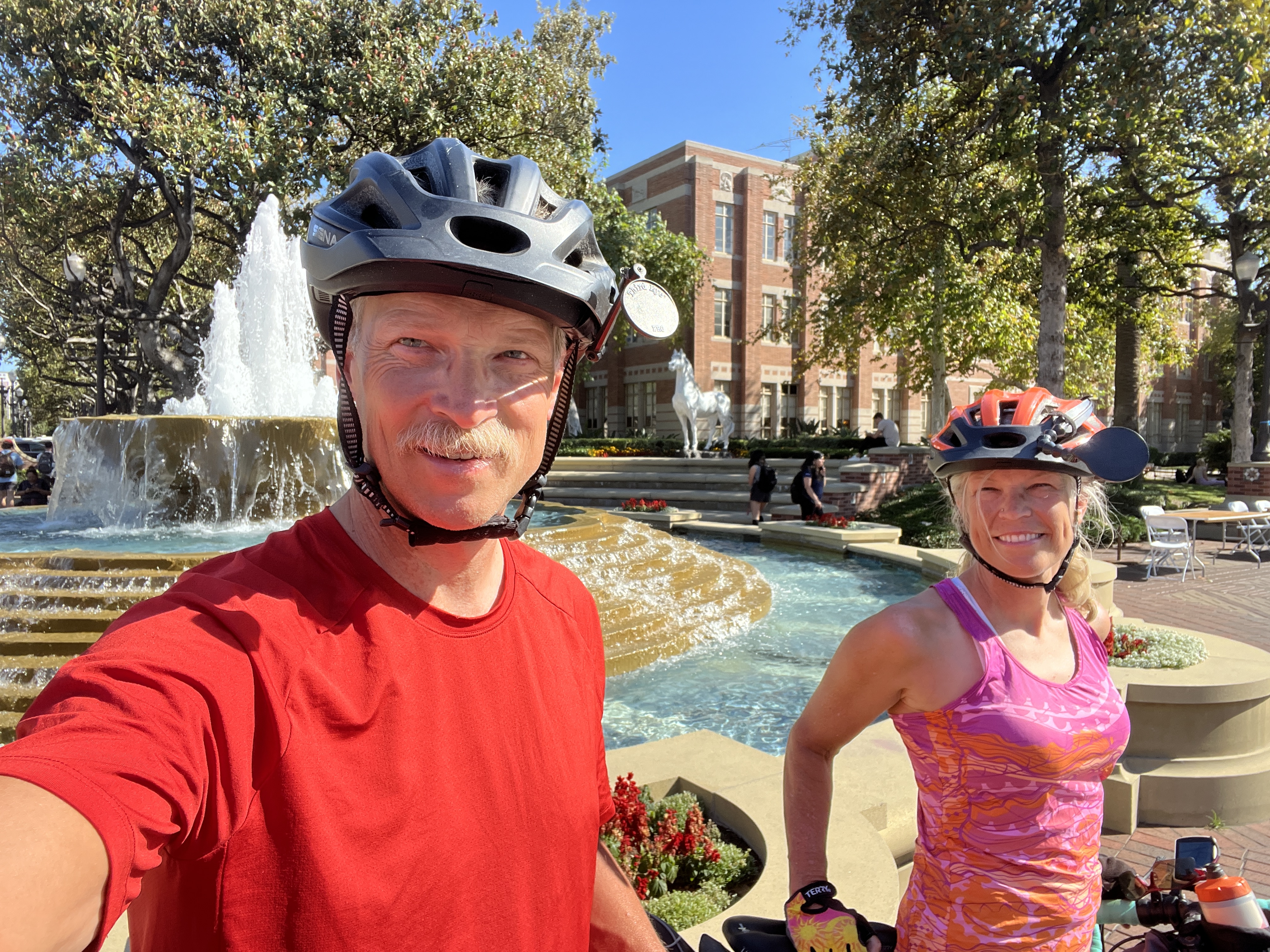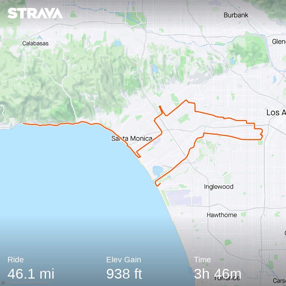 Pesky flat. Beach trail through Santa Monica and into Venice. Google and Donovan. Bradley (near UCLA). Aileen at USC. Me looking back on Rodeo Drive. Ballona Creek Bike Path. Cocktail hour and dinner.